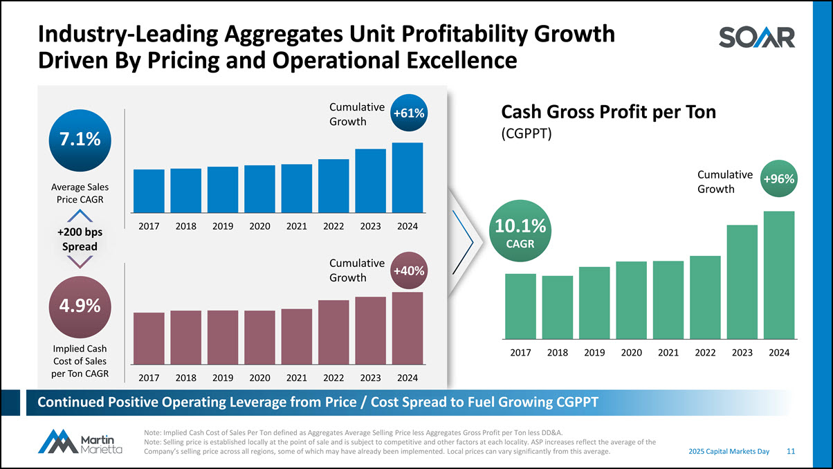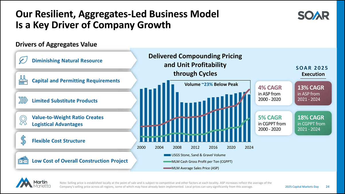 2025 Capital Markets Day  24  Our Resilient, Aggregates-Led Business Model Is a Key Driver of Company Growth  Drivers of Aggregates Value  5% CAGR in CGPPT from 2000 - 2020  Diminishing Natural Resource  Limited Substitute Products  Capital and Permitting Requirements  Flexible Cost Structure  4% CAGRin ASP from 2000 - 2020  Low Cost of Overall Construction Project  18% CAGR in CGPPT from 2021 - 2024  13% CAGRin ASP from 2021 - 2024  SOAR 2025 Execution  Volume ~23% Below Peak  Value-to-Weight Ratio Creates Logistical Advantages  Note: Selling price is established locally at the point of sale and is subject to competitive and other factors at each locality. ASP increases reflect the average of the Company’s selling price across all regions, some of which may have already been implemented. Local prices can vary significantly from this average.
