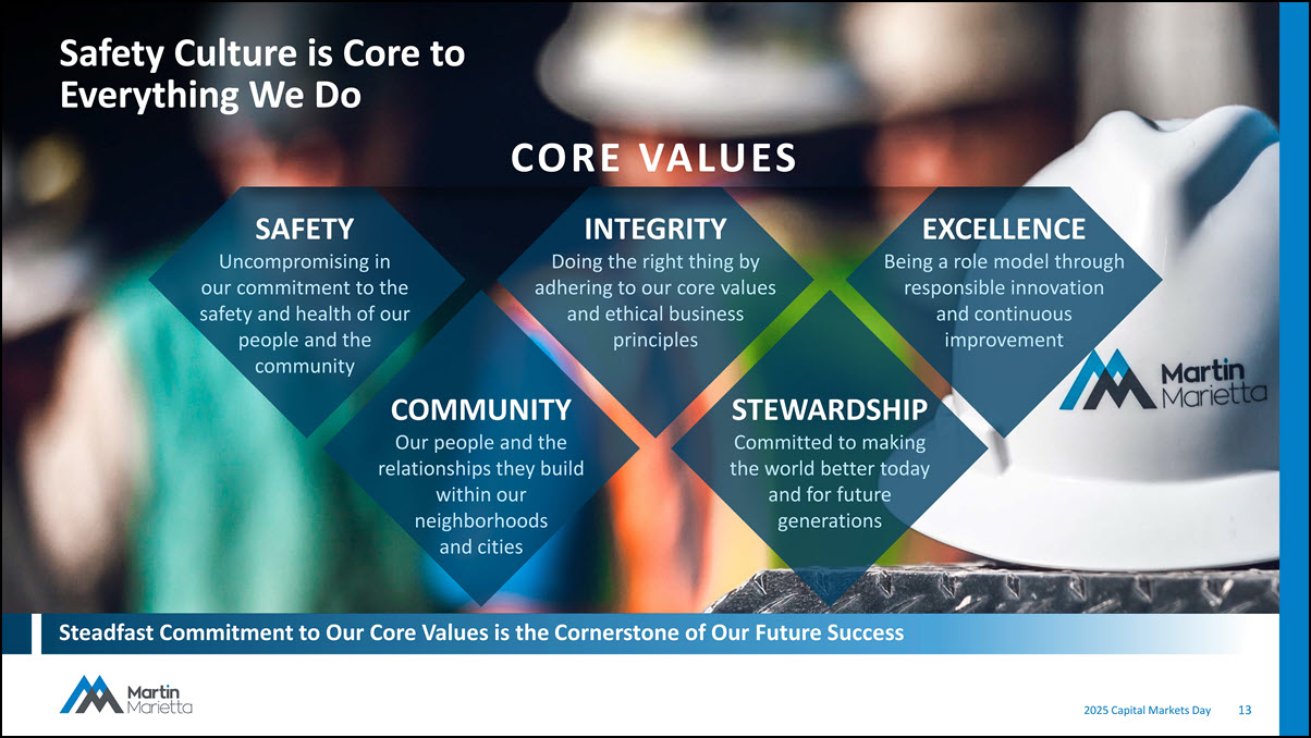 2025 Capital Markets Day  13  Steadfast Commitment to Our Core Values is the Cornerstone of Our Future Success  Safety Culture is Core toEverything We Do  CORE VALUES  INTEGRITY  Doing the right thing by adhering to our core values and ethical business principles  EXCELLENCE  Being a role model through responsible innovation and continuous improvement  STEWARDSHIP  Committed to making the world better today and for future generations  SAFETY  Uncompromising in our commitment to the safety and health of our people and the community  COMMUNITY  Our people and the relationships they build within our neighborhoods and cities