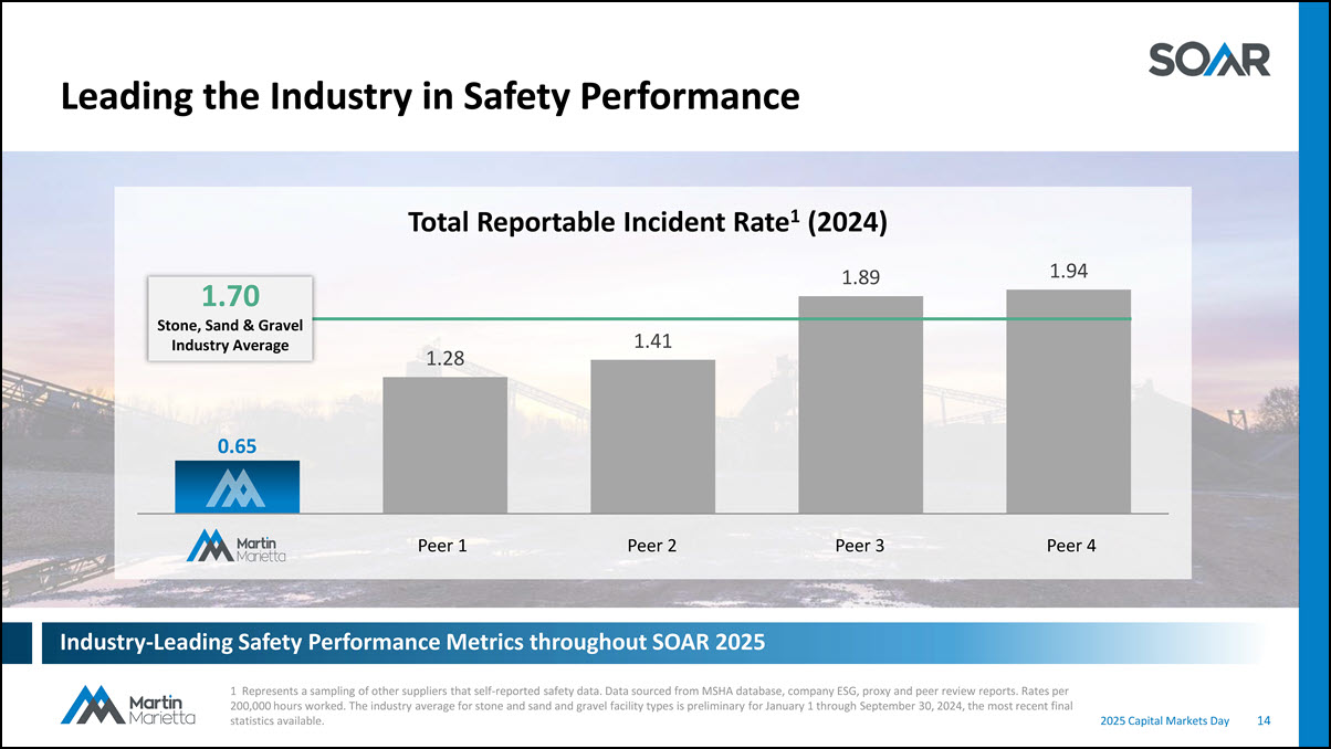 2025 Capital Markets Day  14  Leading the Industry in Safety Performance  Industry-Leading Safety Performance Metrics throughout SOAR 2025  1 Represents a sampling of other suppliers that self-reported safety data. Data sourced from MSHA database, company ESG, proxy and peer review reports. Rates per 200,000 hours worked. The industry average for stone and sand and gravel facility types is preliminary for January 1 through September 30, 2024, the most recent final statistics available.  Total Reportable Incident Rate1 (2024)  Peer 1  Peer 2  Peer 3  Peer 4  1.70  Stone, Sand & Gravel Industry Average