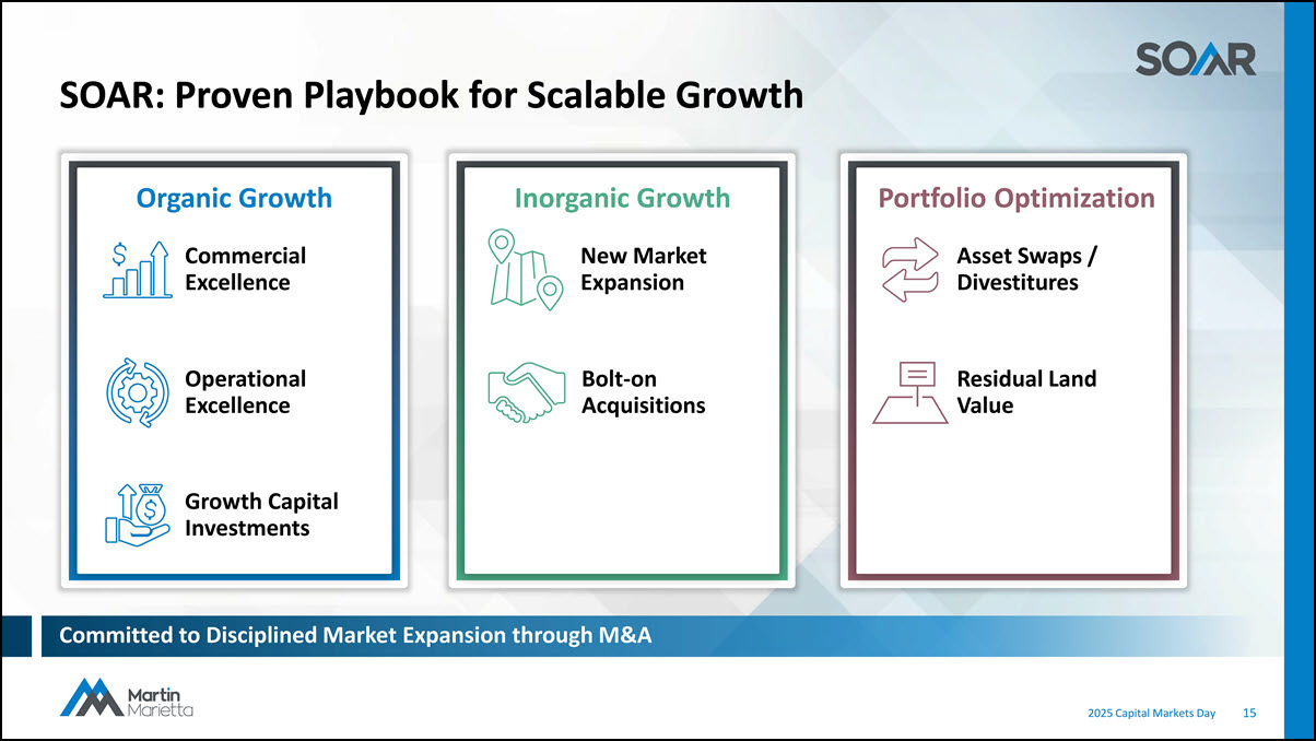 2025 Capital Markets Day  15  SOAR: Proven Playbook for Scalable Growth  Committed to Disciplined Market Expansion through M&A  Inorganic Growth  Portfolio Optimization  Organic Growth  Commercial  Excellence  OperationalExcellence  Asset Swaps /Divestitures  Residual Land Value  Growth Capital Investments  New Market Expansion  Bolt-on Acquisitions