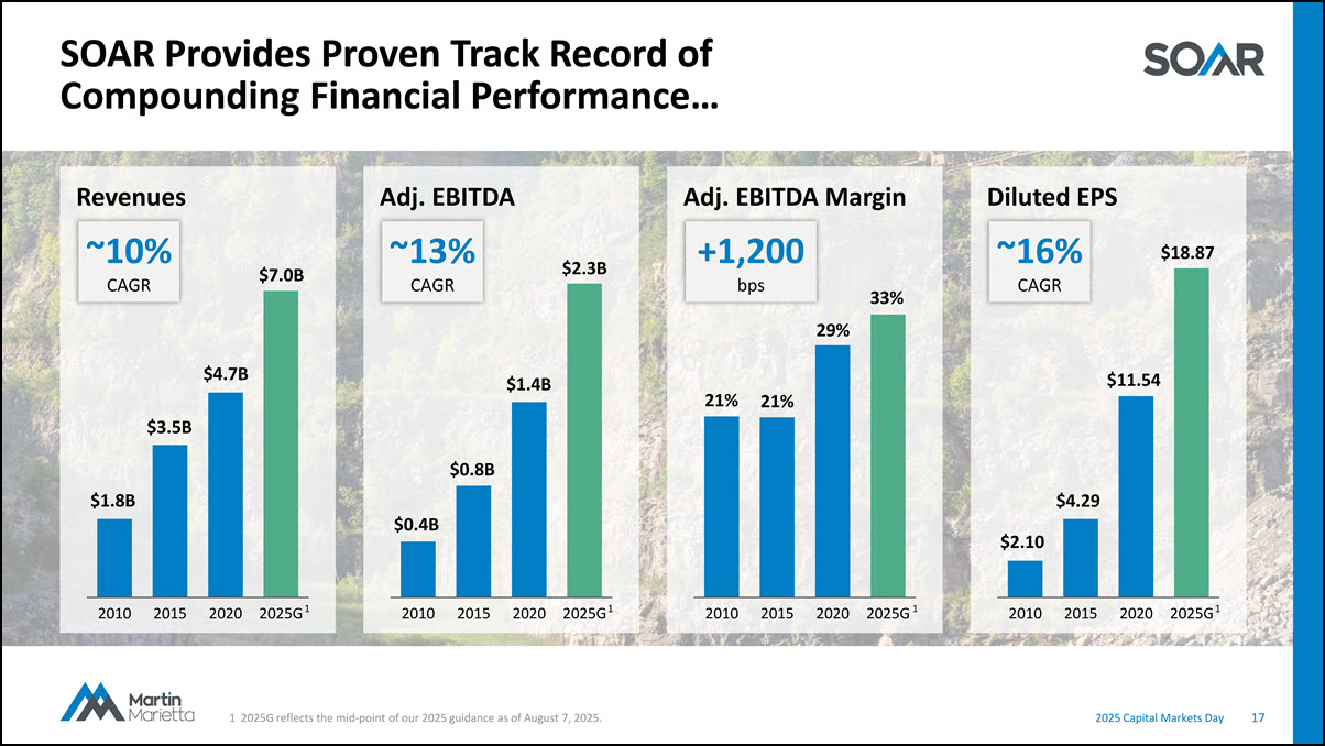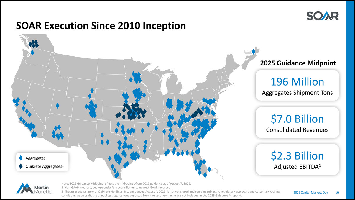16  SOAR Execution Since 2010 Inception  2025 Capital Markets Day  16  2010  131 Million  Aggregates Shipment Tons  $1.8 Billion  Consolidated Revenues  $375 Million  Adjusted EBITDA1  Note: 2025 Guidance Midpoint reflects the mid-point of our 2025 guidance as of August 7, 2025.  1 Non-GAAP measure, see Appendix for reconciliation to nearest GAAP measure  2 The asset exchange with Quikrete Holdings, Inc. announced August 4, 2025, is not yet closed and remains subject to regulatory approvals and customary closing conditions. As a result, the annual aggregates tons expected from the asset exchange are not included in the 2025 Guidance Midpoint.  2025 Guidance Midpoint  196 Million  Aggregates Shipment Tons  $7.0 Billion  Consolidated Revenues  $2.3 Billion  Adjusted EBITDA1  Aggregates  Aggregates  Quikrete Aggregates2