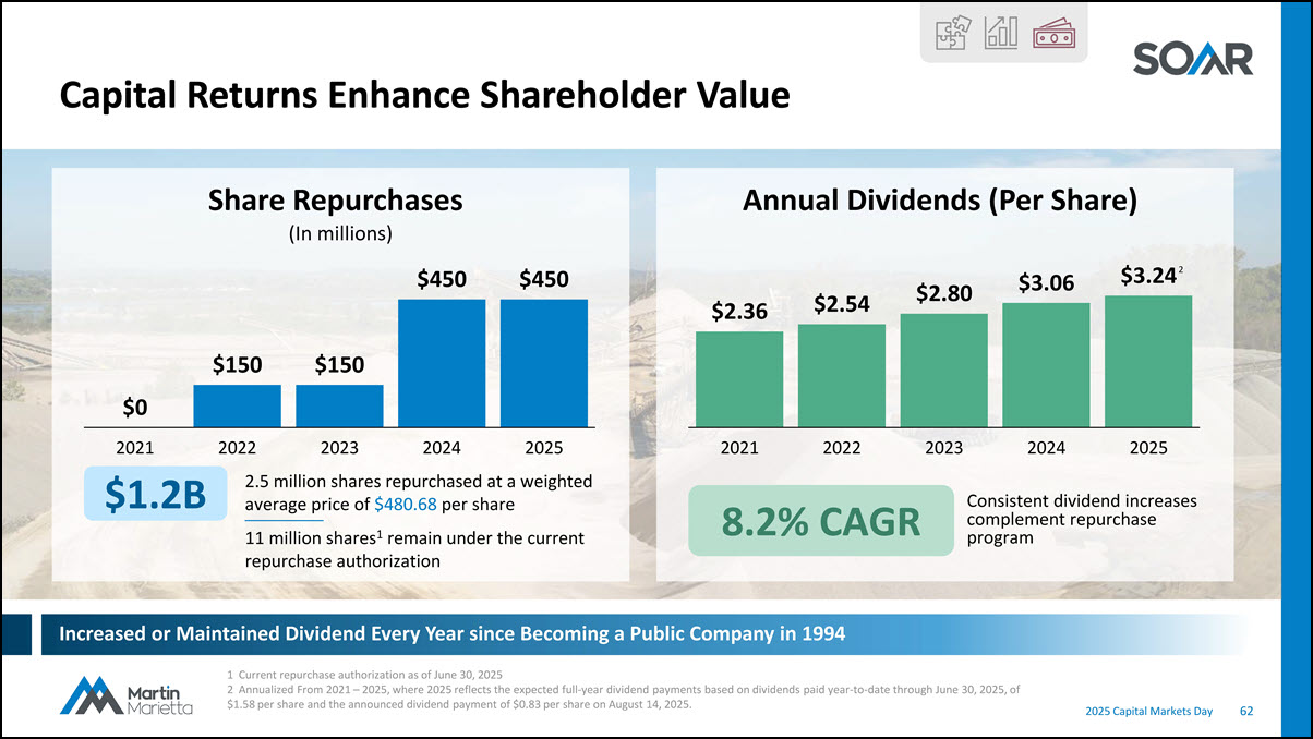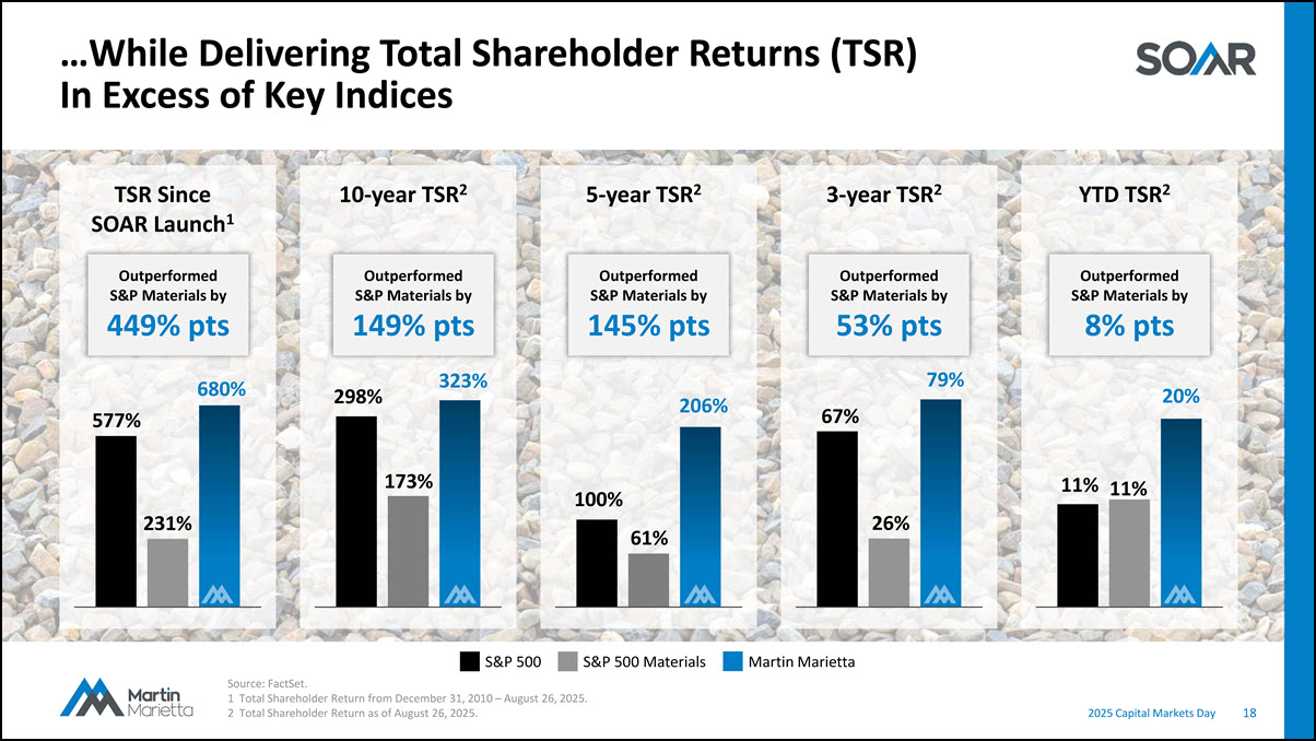 2025 Capital Markets Day  18  Source: FactSet.  1 Total Shareholder Return from December 31, 2010 – August 26, 2025.   2 Total Shareholder Return as of August 26, 2025.   …While Delivering Total Shareholder Returns (TSR) In Excess of Key Indices  Outperformed S&P Materials by  149% pts  10-year TSR2  Outperformed S&P Materials by  145% pts  5-year TSR2  Outperformed S&P Materials by  53% pts  3-year TSR2  Outperformed S&P Materials by  8% pts  YTD TSR2  Outperformed S&P Materials by  449% pts  TSR Since SOAR Launch1  577%  680%  231%  298%  323%  173%  100%  206%  61%  67%  79%  26%  11%  20%  11%  S&P 500  S&P 500 Materials  Martin Marietta