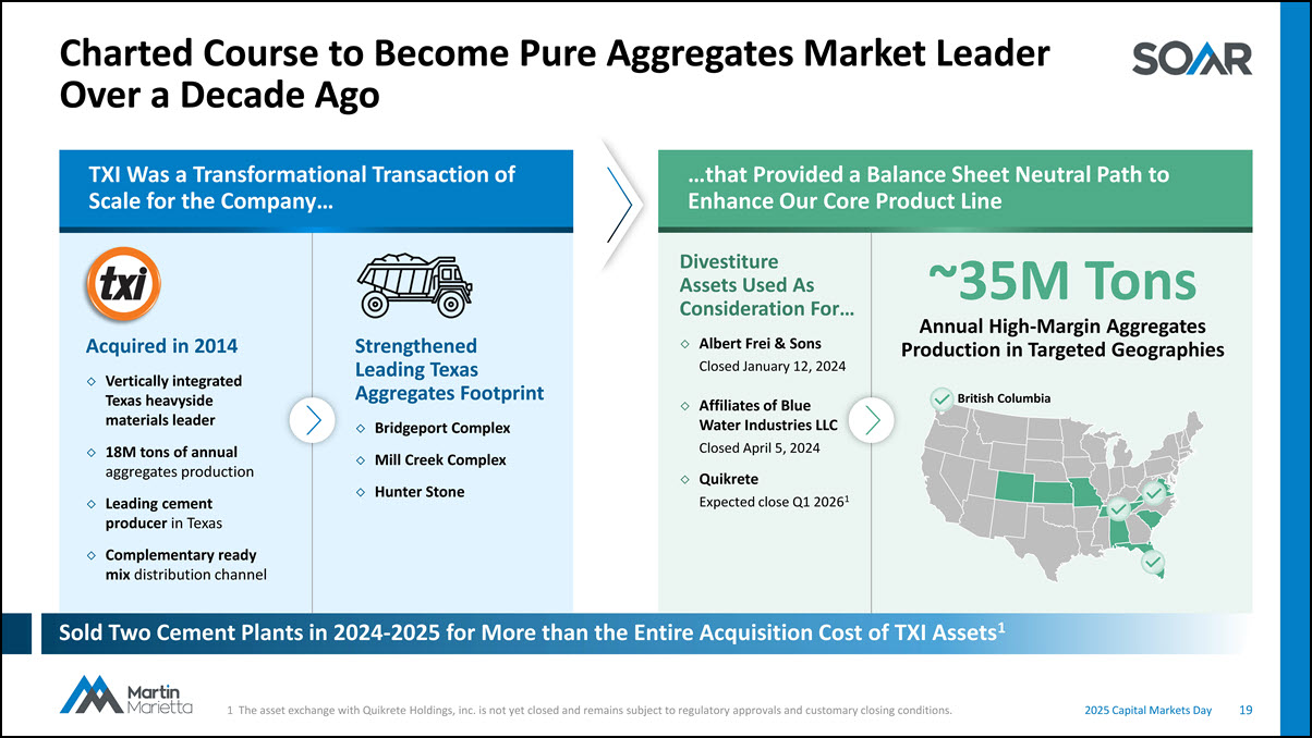 ~35M Tons   Annual High-Margin Aggregates Production in Targeted Geographies  19  Charted Course to Become Pure Aggregates Market Leader Over a Decade Ago  Acquired in 2014  Vertically integrated Texas heavyside materials leader  18M tons of annual aggregates production  Leading cement producer in Texas  Complementary ready mix distribution channel  …that Provided a Balance Sheet Neutral Path to Enhance Our Core Product Line  Sold Two Cement Plants in 2024-2025 for More than the Entire Acquisition Cost of TXI Assets1  2025 Capital Markets Day  TXI Was a Transformational Transaction of Scale for the Company…  Strengthened Leading Texas Aggregates Footprint  Bridgeport Complex  Mill Creek Complex  Hunter Stone   Divestiture Assets Used As Consideration For…  Albert Frei & Sons  Closed January 12, 2024  Affiliates of Blue Water Industries LLC  Closed April 5, 2024  Quikrete  Expected close Q1 20261  1 The asset exchange with Quikrete Holdings, inc. is not yet closed and remains subject to regulatory approvals and customary closing conditions.   British Columbia