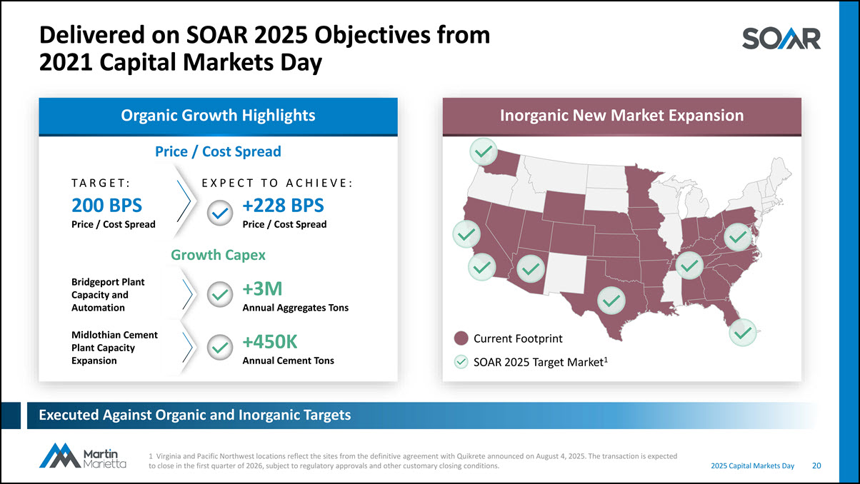 Inorganic New Market Expansion  Organic Growth Highlights  Current Footprint  SOAR 2025 Target Market1  2025 Capital Markets Day  20  Delivered on SOAR 2025 Objectives from 2021 Capital Markets Day  Price / Cost Spread  Executed Against Organic and Inorganic Targets  West  Southwest  East  Central  Growth Capex  200 BPS  Price / Cost Spread  TARGET:  EXPECT TO ACHIEVE:  +228 BPS  Price / Cost Spread  Bridgeport Plant Capacity and Automation  +3M  Annual Aggregates Tons  Midlothian Cement Plant Capacity Expansion  +450K  Annual Cement Tons  1 Virginia and Pacific Northwest locations reflect the sites from the definitive agreement with Quikrete announced on August 4, 2025. The transaction is expected to close in the first quarter of 2026, subject to regulatory approvals and other customary closing conditions.