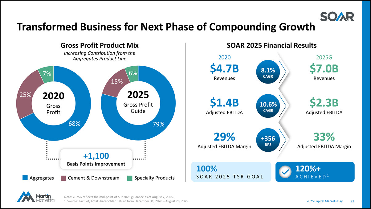 2025 Capital Markets Day  21  Transformed Business for Next Phase of Compounding Growth  Gross Profit Product Mix  SOAR 2025 Financial Results  Increasing Contribution from the   Aggregates Product Line  2020  2025G  2020   GrossProfit  2025   Gross Profit Guide  $4.7BRevenues  $7.0BRevenues  8.1%  CAGR  $1.4BAdjusted EBITDA  $2.3BAdjusted EBITDA  10.6%  CAGR  29%Adjusted EBITDA Margin  33%Adjusted EBITDA Margin  +356  BPS  Aggregates  Cement & Downstream  Specialty Products  100%  SOAR 2025 TSR GOAL  +1,100Basis Points Improvement  120%+  ACHIEVED1  Note: 2025G reflects the mid-point of our 2025 guidance as of August 7, 2025.  1 Source: FactSet; Total Shareholder Return from December 31, 2020 – August 26, 2025.