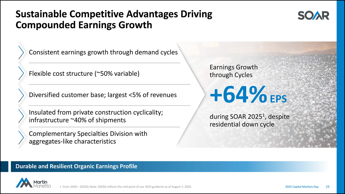2025 Capital Markets Day  23  Sustainable Competitive Advantages Driving Compounded Earnings Growth  Durable and Resilient Organic Earnings Profile  1 From 2020 – 2025G; Note: 2025G reflects the mid-point of our 2025 guidance as of August 7, 2025.  Earnings Growth   through Cycles  +64% EPS  during SOAR 20251, despite residential down cycle  Flexible cost structure (~50% variable)  Diversified customer base; largest <5% of revenues  Insulated from private construction cyclicality; infrastructure ~40% of shipments  Complementary Specialties Division with aggregates-like characteristics  Consistent earnings growth through demand cycles