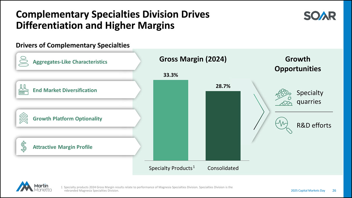 2025 Capital Markets Day  26  Complementary Specialties Division Drives Differentiation and Higher Margins  Drivers of Complementary Specialties  Gross Margin (2024)  Growth Opportunities  Specialty quarries  R&D efforts  Attractive Margin Profile  Growth Platform Optionality  End Market Diversification  Aggregates-Like Characteristics  1 Specialty products 2024 Gross Margin results relate to performance of Magnesia Specialties Division. Specialties Division is the rebranded Magnesia Specialties Division.  1