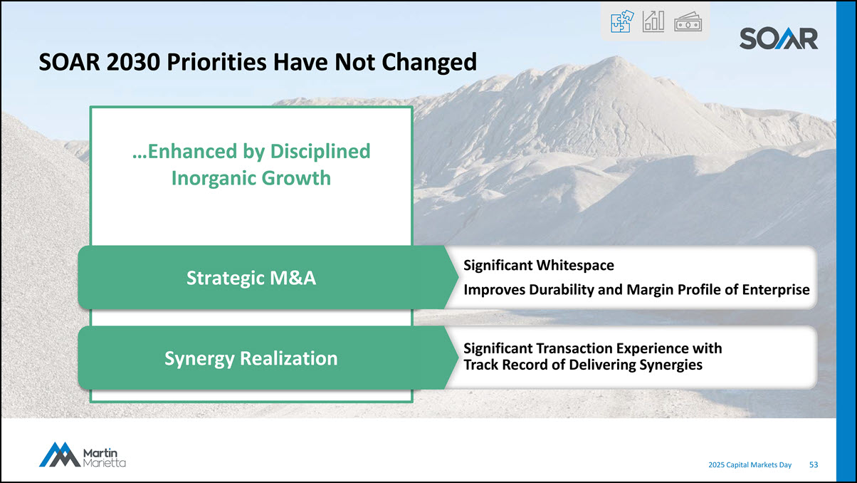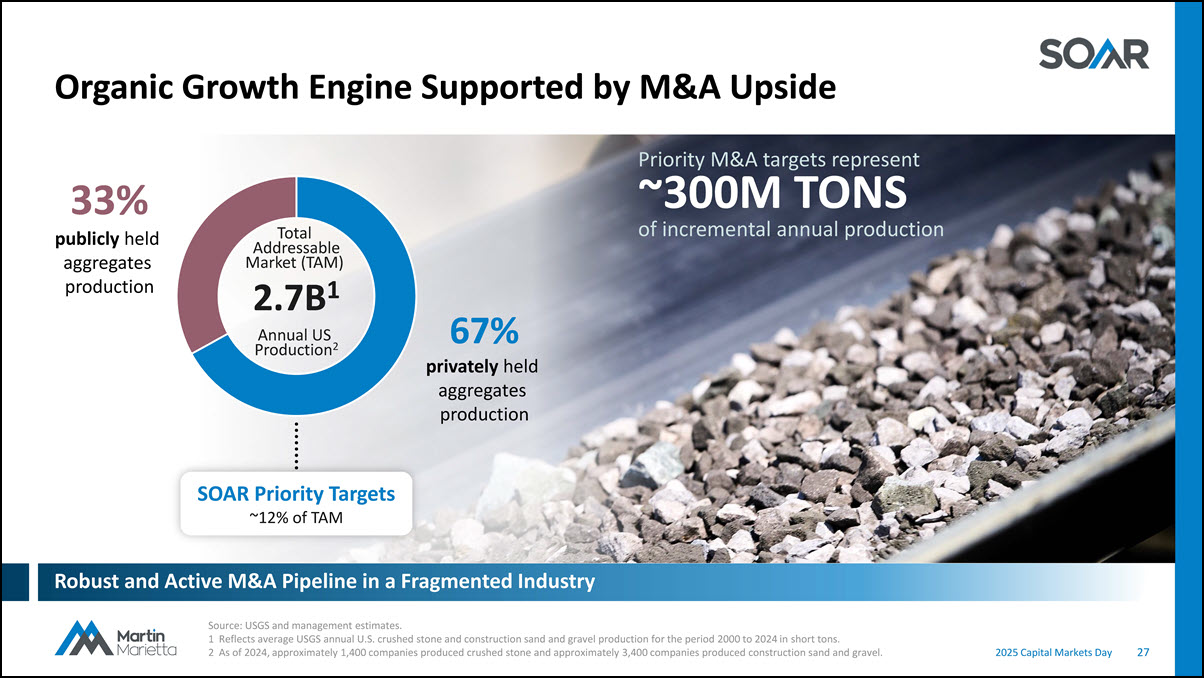2025 Capital Markets Day  27  Organic Growth Engine Supported by M&A Upside  Robust and Active M&A Pipeline in a Fragmented Industry  Total   Addressable  Market (TAM)   2.7B1  Annual US   Production2  67%  privately held   aggregates production  33%  publicly held   aggregates production  SOAR Priority Targets~12% of TAM  Source: USGS and management estimates.  1 Reflects average USGS annual U.S. crushed stone and construction sand and gravel production for the period 2000 to 2024 in short tons.  2 As of 2024, approximately 1,400 companies produced crushed stone and approximately 3,400 companies produced construction sand and gravel.  Priority M&A targets represent   ~300M tonsof incremental annual production
