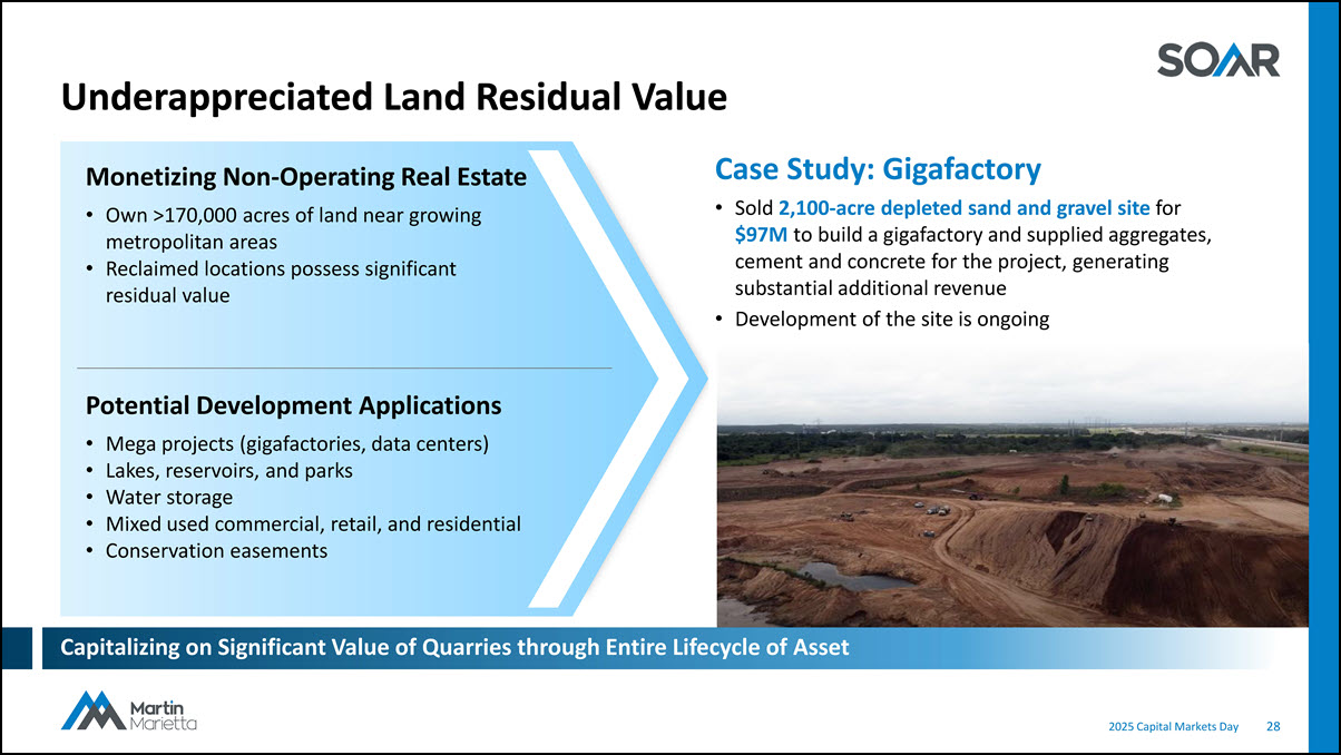 2025 Capital Markets Day  28  Underappreciated Land Residual Value  Capitalizing on Significant Value of Quarries through Entire Lifecycle of Asset  Monetizing Non-Operating Real Estate  Own >170,000 acres of land near growing metropolitan areas  Reclaimed locations possess significant residual value  Potential Development Applications   Mega projects (gigafactories, data centers)  Lakes, reservoirs, and parks  Water storage  Mixed used commercial, retail, and residential  Conservation easements  Sold 2,100-acre depleted sand and gravel site for $97M to build a gigafactory and supplied aggregates, cement and concrete for the project, generating substantial additional revenue  Development of the site is ongoing  Case Study: Gigafactory