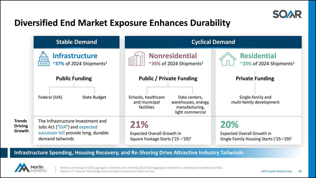 Single-family and   multi-family development  Residential  ~23% of 2024 Shipments1  Private Funding  20%  Expected Overall Growth in Single Family Housing Starts (‘25–’29)2  2025 Capital Markets Day  30  Schools, healthcare and municipal facilities  Data centers, warehouses, energy, manufacturing, light commercial  Public / Private Funding  Nonresidential  ~35% of 2024 Shipments1  21%  Expected Overall Growth in Square Footage Starts (‘25 –’29)2  Reflects percentage of 2024 aggregates shipments; the remaining 5% of 2024 aggregates shipments is attributed to ChemRock and Rail.  Based on 2nd Quarter 2025 Dodge Data & Analytics construction starts forecast  Diversified End Market Exposure Enhances Durability  Infrastructure Spending, Housing Recovery, and Re-Shoring Drive Attractive Industry Tailwinds  Stable Demand  Cyclical Demand  TrendsDriving  Growth  State Budget  Federal (IIJA)   Public Funding  Infrastructure  ~37% of 2024 Shipments1  The Infrastructure Investment and Jobs Act (“IIJA”) and expected successor bill provide long, durable demand tailwinds