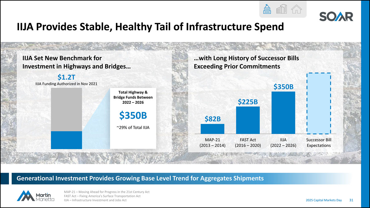 2025 Capital Markets Day  31  IIJA Provides Stable, Healthy Tail of Infrastructure Spend   Generational Investment Provides Growing Base Level Trend for Aggregates Shipments  $350B  Total Highway & Bridge Funds Between2022 – 2026  ~29% of Total IIJA  $1.2TIIJA Funding Authorized in Nov 2021  IIJA Set New Benchmark for Investment in Highways and Bridges…  …with Long History of Successor BillsExceeding Prior Commitments  $82B  $225B  $350B  MAP-21 – Moving Ahead for Progress in the 21st Century Act  FAST Act – Fixing America’s Surface Transportation Act  IIJA – Infrastructure Investment and Jobs Act