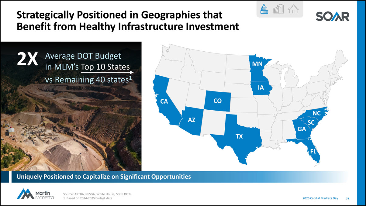 2025 Capital Markets Day  32  For Review  Source: ARTBA, NSSGA, White House, State DOTs.  1 Based on 2024-2025 budget data.  Uniquely Positioned to Capitalize on Significant Opportunities  Strategically Positioned in Geographies that Benefit from Healthy Infrastructure Investment  West  Southwest  East  Central  MI  0.3%  Average DOT Budgetin MLM’s Top 10 States  vs Remaining 40 states1  2X  TX  CA  NC  CO   GA  MN  AZ  FL  IA  SC