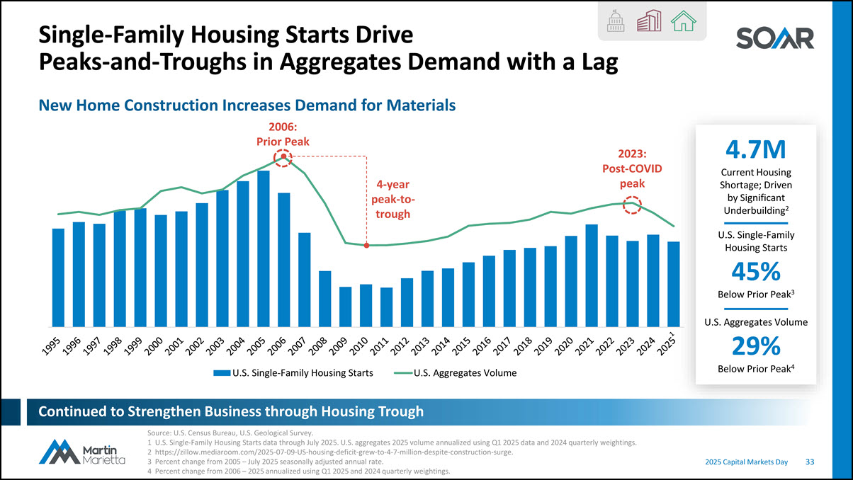 2025 Capital Markets Day  33  Source: U.S. Census Bureau, U.S. Geological Survey.  1 U.S. Single-Family Housing Starts data through July 2025. U.S. aggregates 2025 volume annualized using Q1 2025 data and 2024 quarterly weightings.   2 https://zillow.mediaroom.com/2025-07-09-US-housing-deficit-grew-to-4-7-million-despite-construction-surge.   3 Percent change from 2005 – July 2025 seasonally adjusted annual rate.   4 Percent change from 2006 – 2025 annualized using Q1 2025 and 2024 quarterly weightings.  Single-Family Housing Starts Drive Peaks-and-Troughs in Aggregates Demand with a Lag  Continued to Strengthen Business through Housing Trough  2023:Post-COVID peak  New Home Construction Increases Demand for Materials  4.7M  Current Housing Shortage; Driven by Significant Underbuilding2  U.S. Single-Family Housing Starts   45%  Below Prior Peak3  U.S. Aggregates Volume  29%  Below Prior Peak4  4-year peak-to-trough  2006:Prior Peak  1