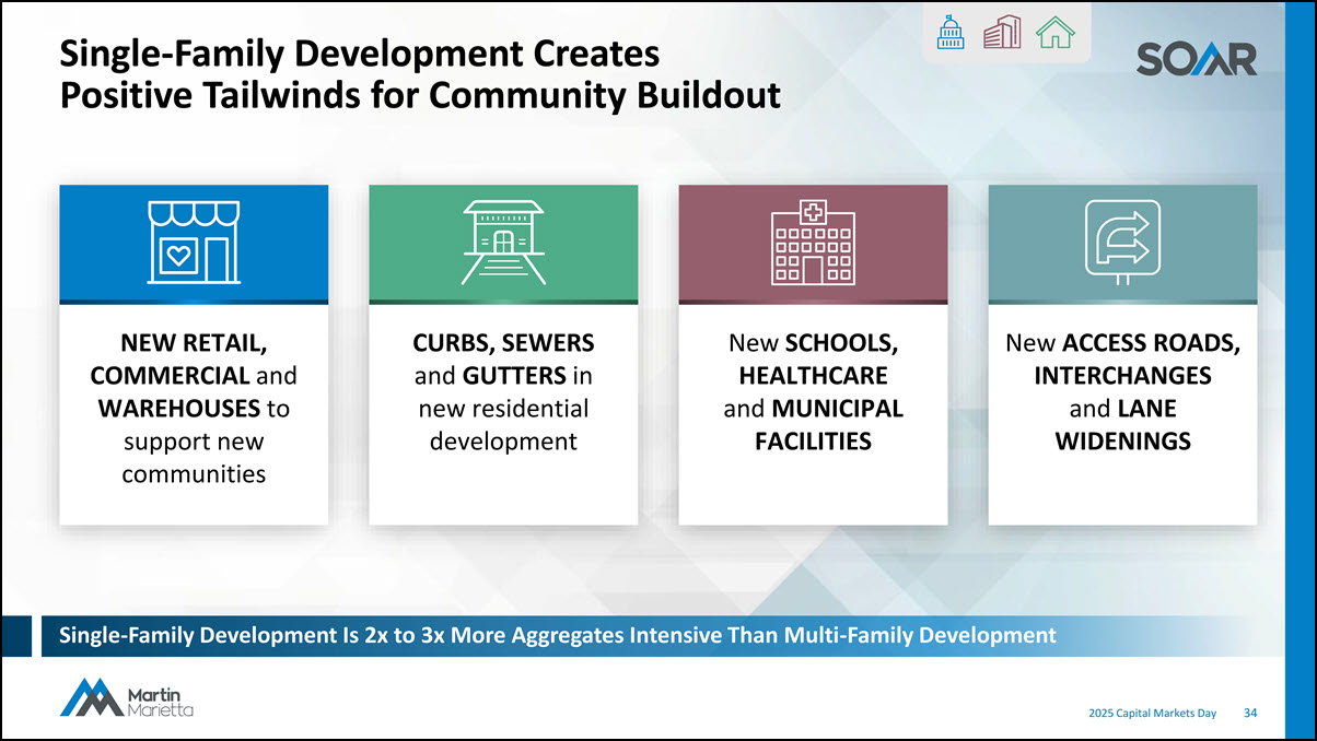 2025 Capital Markets Day  34  Single-Family Development Creates Positive Tailwinds for Community Buildout  Single-Family Development Is 2x to 3x More Aggregates Intensive Than Multi-Family Development  Curbs, sewers and gutters in new residential development  New access roads, interchanges   and lane widenings  New retail, commercial and warehouses to support new communities  New schools, healthcare and municipal facilities
