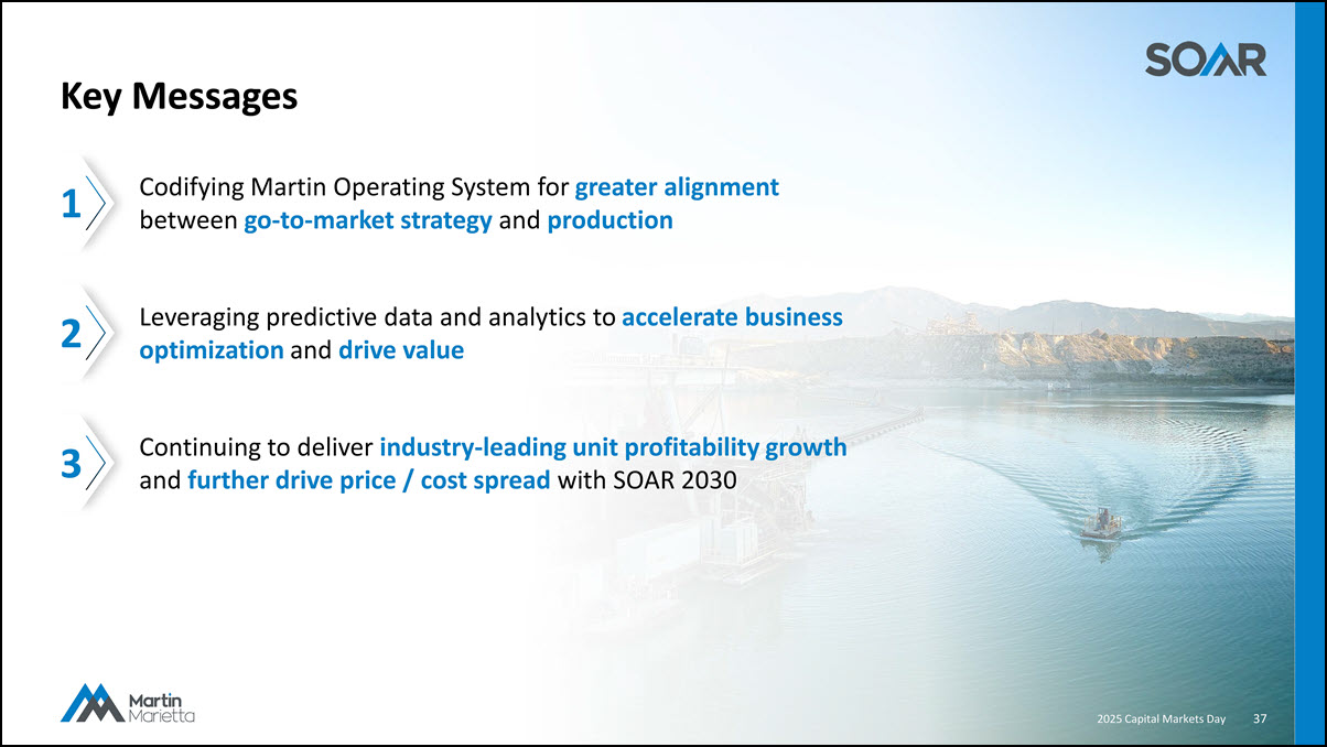 2025 Capital Markets Day  37  Key Messages  Leveraging predictive data and analytics to accelerate business optimization and drive value  2  Continuing to deliver industry-leading unit profitability growthand further drive price / cost spread with SOAR 2030  3  Codifying Martin Operating System for greater alignment between go-to-market strategy and production  1