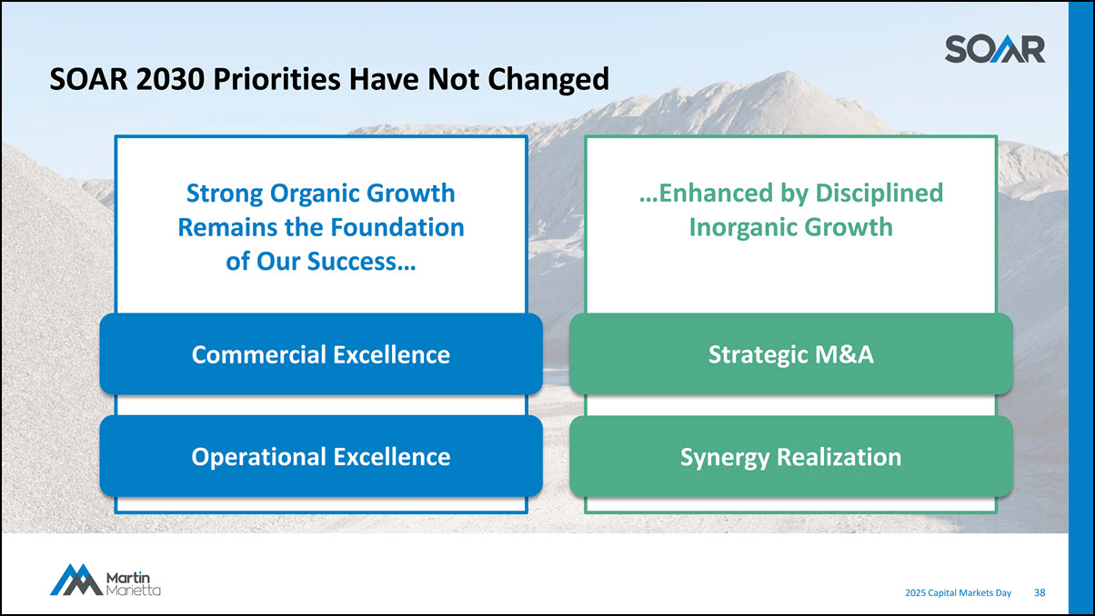 2025 Capital Markets Day  38  SOAR 2030 Priorities Have Not Changed  …Enhanced by Disciplined Inorganic Growth  Strong Organic Growth Remains the Foundation of Our Success…  Commercial Excellence  Operational Excellence  Strategic M&A  Synergy Realization