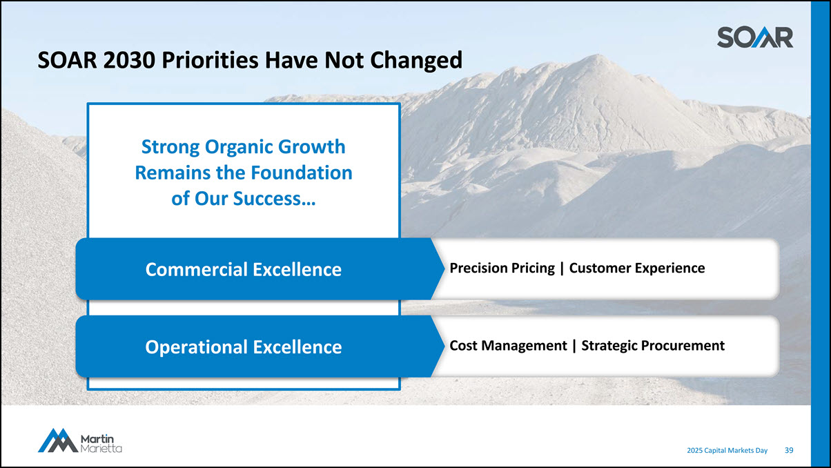 2025 Capital Markets Day  39  SOAR 2030 Priorities Have Not Changed  Strong Organic Growth Remains the Foundation of Our Success…  Precision Pricing | Customer Experience  Cost Management | Strategic Procurement  Commercial Excellence  Operational Excellence