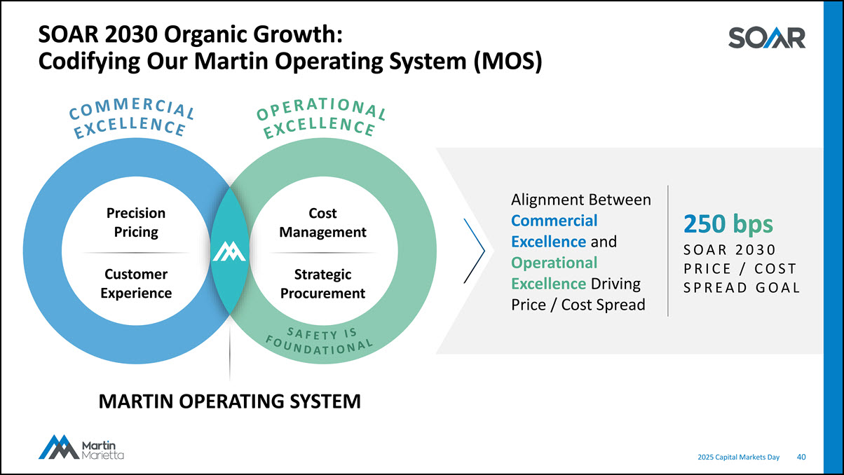 250 bps  SOAR 2030 PRICE / COST SPREAD GOAL  Alignment Between Commercial Excellence and Operational Excellence Driving Price / Cost Spread  OPERATIONALEXCELLENCE  Precision Pricing  Customer Experience  SOAR 2030 Organic Growth: Codifying Our Martin Operating System (MOS)  Strategic Procurement  Cost Management  SAFETY ISFOUNDATIONAL  2025 Capital Markets Day  40  COMMERCIALEXCELLENCE  MARTIN OPERATING SYSTEM
