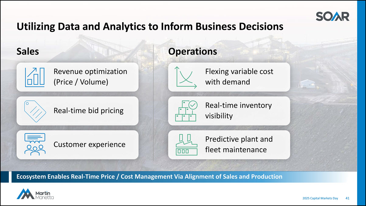 Revenue optimization (Price / Volume)  Flexing variable cost with demand  Real-time bid pricing  Real-time inventory visibility  Customer experience  Sales  Operations  2025 Capital Markets Day  41  Ecosystem Enables Real-Time Price / Cost Management Via Alignment of Sales and Production  Utilizing Data and Analytics to Inform Business Decisions  Predictive plant and fleet maintenance