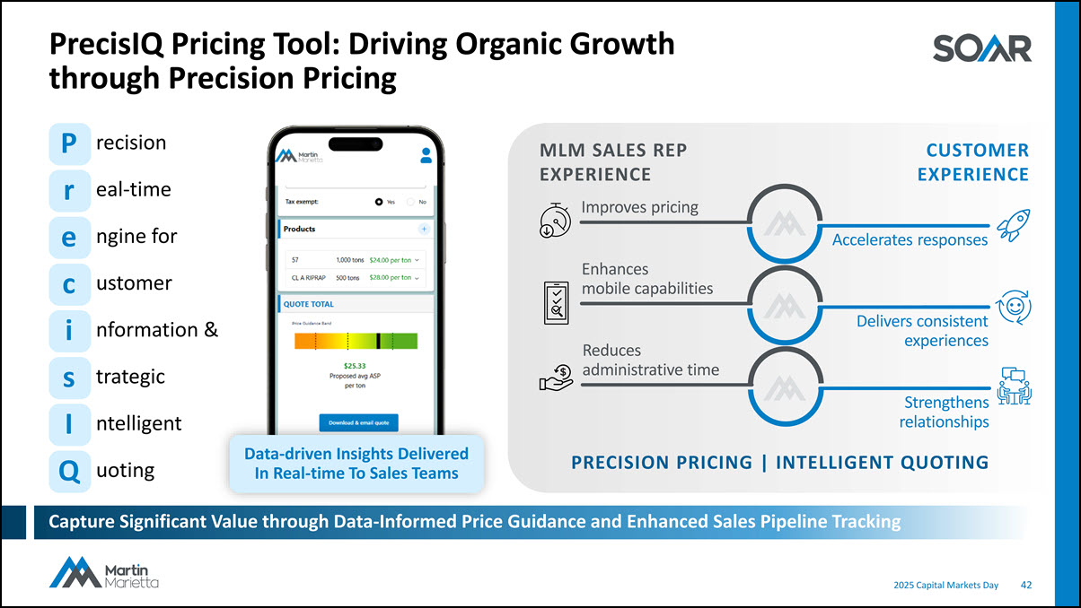recision  P  r  e  c  i  s  I  Q  eal-time  ngine for  ustomer  nformation &  trategic  ntelligent  uoting  2025 Capital Markets Day  42  PrecisIQ Pricing Tool: Driving Organic Growth through Precision Pricing  Capture Significant Value through Data-Informed Price Guidance and Enhanced Sales Pipeline Tracking  CUSTOMER EXPERIENCE  MLM SALES REP EXPERIENCE  Improves pricing  Accelerates responses  Enhances mobile capabilities  Delivers consistent experiences  Reduces administrative time  Strengthens relationships  PRECISION PRICING | INTELLIGENT QUOTING  Data-driven Insights Delivered In Real-time To Sales Teams