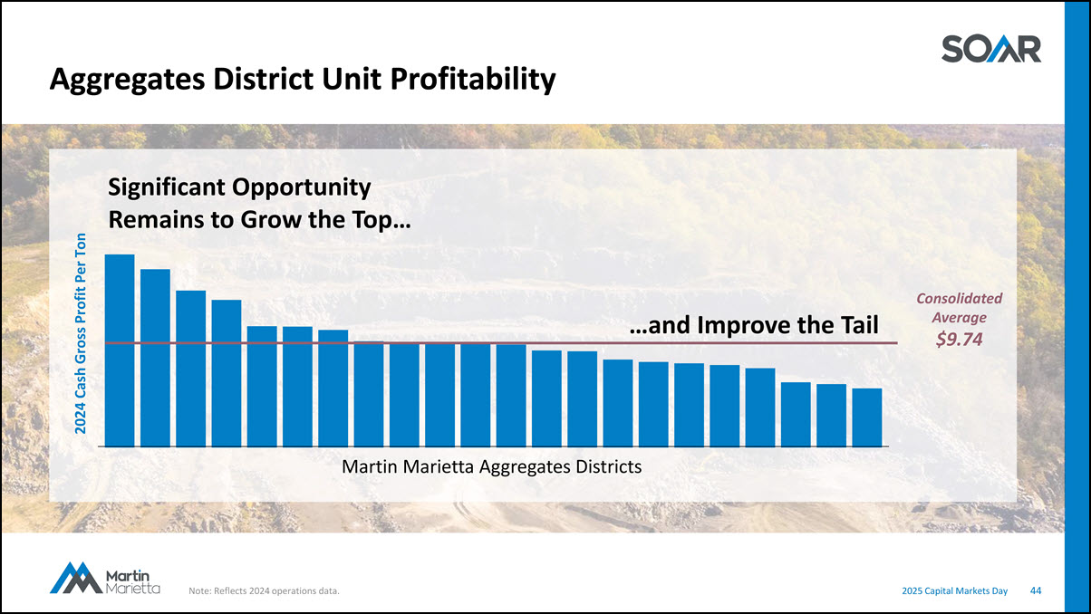 2025 Capital Markets Day  44  Aggregates District Unit Profitability  Note: Reflects 2024 operations data.  Significant Opportunity Remains to Grow the Top…  2024 Cash Gross Profit Per Ton  …and Improve the Tail  Martin Marietta Aggregates Districts  Consolidated   Average  $9.74