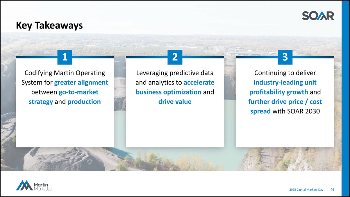 2025 Capital Markets Day  46  Key Takeaways  Key Takeaways  Continuing to deliver industry-leading unit profitability growth and further drive price / cost spread with SOAR 2030  Leveraging predictive data and analytics to accelerate business optimization and drive value  Codifying Martin Operating System for greater alignment between go-to-market strategy and production  3  2  1