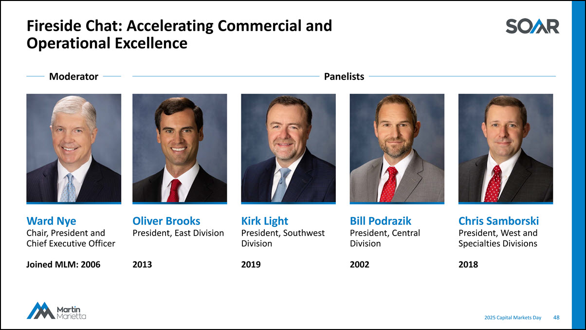2025 Capital Markets Day  48  Fireside Chat: Accelerating Commercial and Operational Excellence   Ward Nye  Chair, President and Chief Executive Officer  Joined MLM: 2006  Oliver Brooks  President, East Division  2013  Kirk Light  President, Southwest Division  2019  Bill Podrazik  President, Central Division  2002  Chris Samborski  President, West and Specialties Divisions  2018  Moderator  Panelists