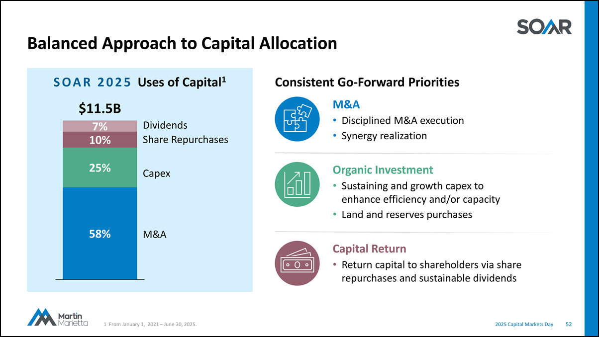 2025 Capital Markets Day  52  Balanced Approach to Capital Allocation  Consistent Go-Forward Priorities  SOAR 2025 Uses of Capital1  1 From January 1, 2021 – June 30, 2025.   $11.5B  M&A  Share Repurchases  Capex  Dividends  M&A  Disciplined M&A execution  Synergy realization  Organic Investment  Sustaining and growth capex to enhance efficiency and/or capacity  Land and reserves purchases  Capital Return  Return capital to shareholders via share repurchases and sustainable dividends