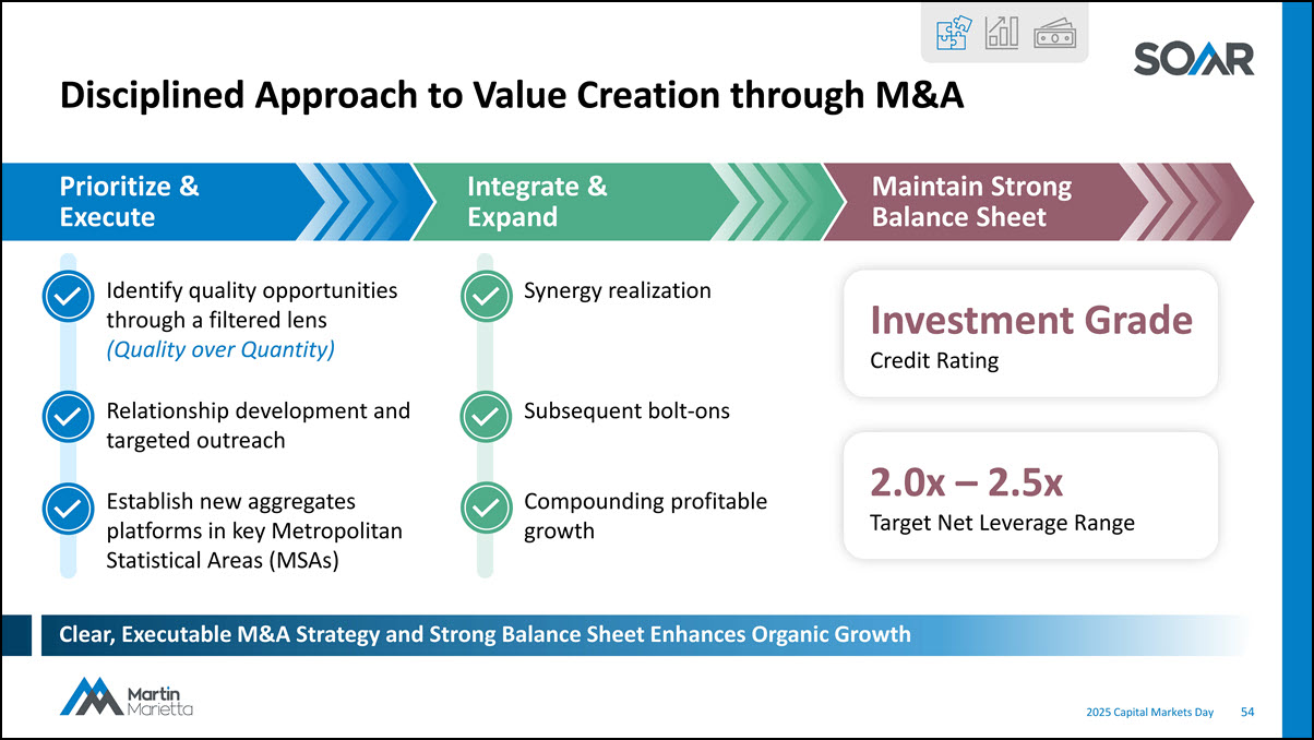 2025 Capital Markets Day  54  Disciplined Approach to Value Creation through M&A  Clear, Executable M&A Strategy and Strong Balance Sheet Enhances Organic Growth  Prioritize & Execute   Integrate & Expand   Maintain StrongBalance Sheet  Identify quality opportunities through a filtered lens   (Quality over Quantity)  Synergy realization  Relationship development and targeted outreach  Subsequent bolt-ons  Establish new aggregates platforms in key Metropolitan Statistical Areas (MSAs)  Compounding profitablegrowth  Investment Grade  Credit Rating  2.0x – 2.5x  Target Net Leverage Range