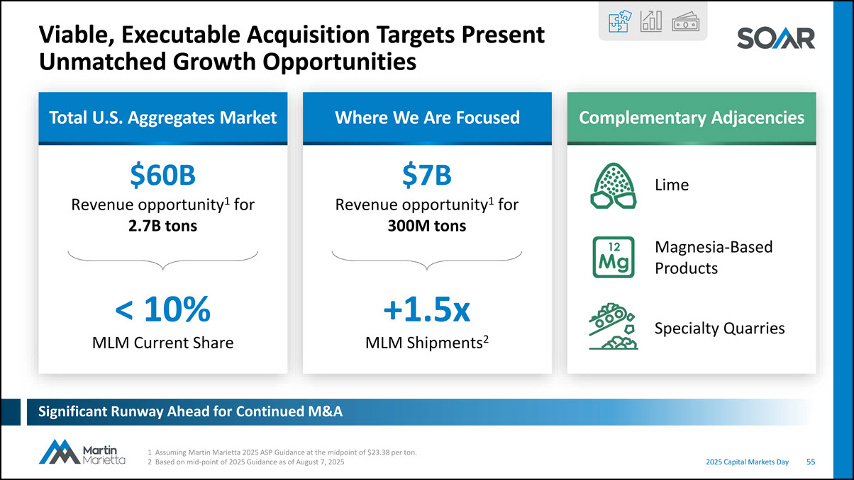2025 Capital Markets Day  55  Viable, Executable Acquisition Targets Present Unmatched Growth Opportunities  Significant Runway Ahead for Continued M&A  1 Assuming Martin Marietta 2025 ASP Guidance at the midpoint of $23.38 per ton.  2 Based on mid-point of 2025 Guidance as of August 7, 2025  Total U.S. Aggregates Market  Where We Are Focused  Complementary Adjacencies  < 10%  MLM Current Share  $60B  Revenue opportunity1 for 2.7B tons  +1.5x  MLM Shipments2  $7B  Revenue opportunity1 for 300M tons  Lime  Magnesia-Based Products  Specialty Quarries
