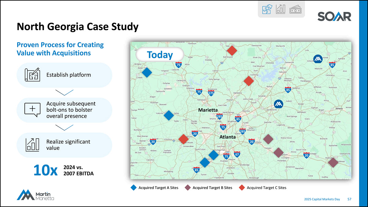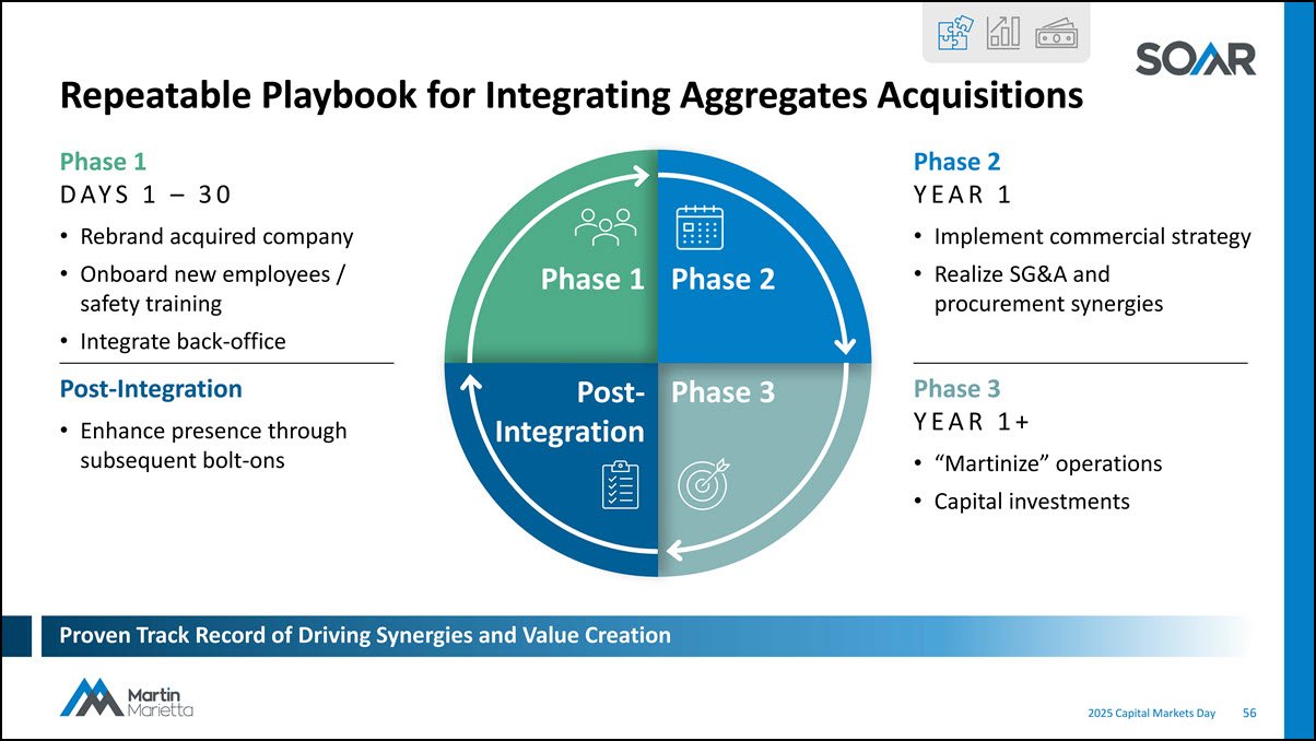 2025 Capital Markets Day  56  Repeatable Playbook for Integrating Aggregates Acquisitions  Proven Track Record of Driving Synergies and Value Creation  Phase 1  Phase 3  Phase 2   Post-Integration  Phase 1  DAYS 1 – 30  Rebrand acquired company  Onboard new employees / safety training  Integrate back-office  Post-Integration   Enhance presence through subsequent bolt-ons  Phase 2 YEAR 1  Implement commercial strategy  Realize SG&A and procurement synergies  Phase 3  YEAR 1+  “Martinize” operations  Capital investments