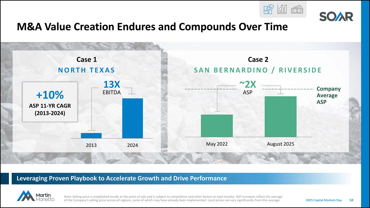 2025 Capital Markets Day  58  M&A Value Creation Endures and Compounds Over Time  Leveraging Proven Playbook to Accelerate Growth and Drive Performance  +10%  ASP 11-YR CAGR (2013-2024)  NORTH TEXAS  Case 1  SAN BERNARDINO / RIVERSIDE  Case 2  Note: Selling price is established locally at the point of sale and is subject to competitive and other factors at each locality. ASP increases reflect the average of the Company’s selling price across all regions, some of which may have already been implemented. Local prices can vary significantly from this average.  Company Average ASP  ~2X  ASP  13X  EBITDA