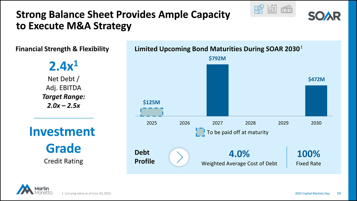 2025 Capital Markets Day  59  Strong Balance Sheet Provides Ample Capacity to Execute M&A Strategy  Investment   Grade  Credit Rating  2.4x1  Net Debt / Adj. EBITDA  Target Range: 2.0x – 2.5x   Limited Upcoming Bond Maturities During SOAR 2030  Financial Strength & Flexibility  1 Carrying value as of June 30, 2025.  Debt Profile  4.0%  Weighted Average Cost of Debt  100%  Fixed Rate  $125M  $792M  To be paid off at maturity  $472M  1