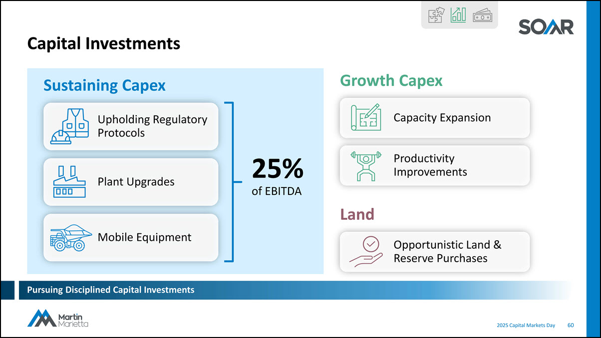 Upholding Regulatory Protocols  Plant Upgrades  Mobile Equipment  2025 Capital Markets Day  60  Capital Investments  Pursuing Disciplined Capital Investments  Sustaining Capex  25%   of EBITDA  Growth Capex  Land  Capacity Expansion  Productivity Improvements  Opportunistic Land & Reserve Purchases