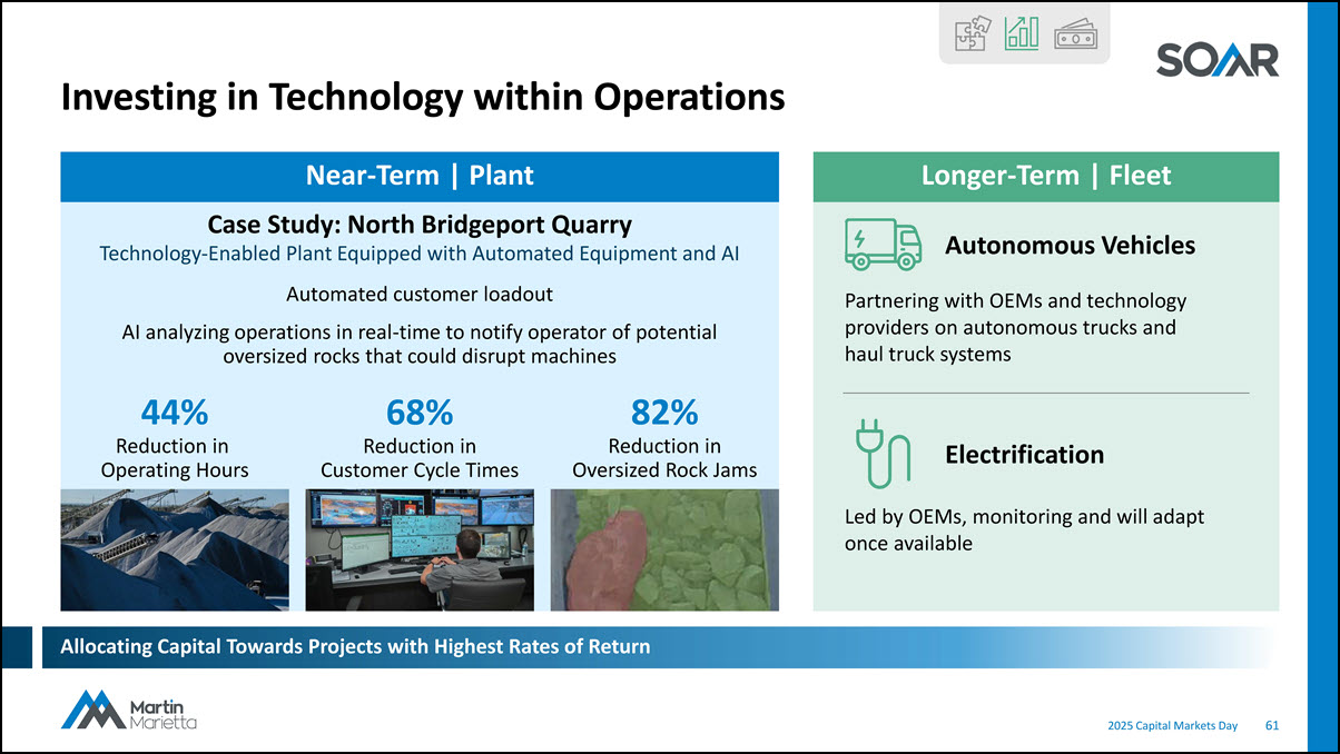 2025 Capital Markets Day  61  Investing in Technology within Operations  Allocating Capital Towards Projects with Highest Rates of Return  Near-Term | Plant  Longer-Term | Fleet  Autonomous Vehicles  Electrification  Partnering with OEMs and technology providers on autonomous trucks and haul truck systems   Led by OEMs, monitoring and will adapt once available  Case Study: North Bridgeport Quarry  Technology-Enabled Plant Equipped with Automated Equipment and AI  44%  Reduction in Operating Hours  68%  Reduction inCustomer Cycle Times   82%  Reduction inOversized Rock Jams  Automated customer loadout  AI analyzing operations in real-time to notify operator of potential oversized rocks that could disrupt machines
