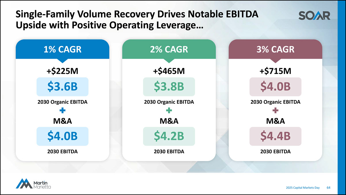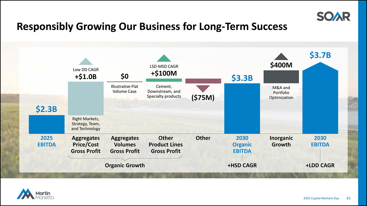 2025 Capital Markets Day  63  Responsibly Growing Our Business for Long-Term Success  Organic Growth  Illustrative Flat Volume Case  Cement, Downstream, and Specialty products  M&A and Portfolio Optimization  $2.3B  $0  +$100M  $400M  Right Markets, Strategy, Team, and Technology  +$1.0B  Low DD CAGR  $3.7B  2025 EBITDA  Aggregates Price/Cost Gross Profit  Aggregates Volumes Gross Profit  Other Product Lines Gross Profit  2030 Organic EBITDA  Inorganic Growth  2030EBITDA  Other  $3.3B  +HSD CAGR  ($75M)  LSD-MSD CAGR  +LDD CAGR