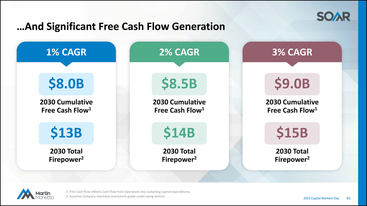 2025 Capital Markets Day  65  …And Significant Free Cash Flow Generation  1 Free Cash Flow reflects Cash Flow from Operations less sustaining capital expenditures.   2 Assumes Company maintains investment-grade credit rating metrics.  $8.0B  2030 CumulativeFree Cash Flow1  3% CAGR  2% CAGR  1% CAGR  $8.5B  2030 CumulativeFree Cash Flow1  $9.0B  2030 CumulativeFree Cash Flow1  $13B  2030 TotalFirepower2  $14B  2030 TotalFirepower2  $15B  2030 TotalFirepower2