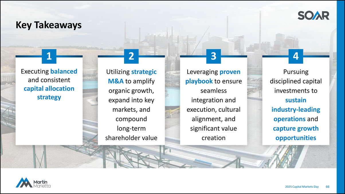 2025 Capital Markets Day  66  Key Takeaways  Key Takeaways  Key Takeaways  Pursuing disciplined capital investments to sustain industry-leading operations and capture growth opportunities  Utilizing strategic M&A to amplify organic growth, expand into key markets, and compound long-term shareholder value  Executing balanced and consistent capital allocation strategy  2  1  Leveraging proven playbook to ensure seamless integration and execution, cultural alignment, and significant value creation  3  4