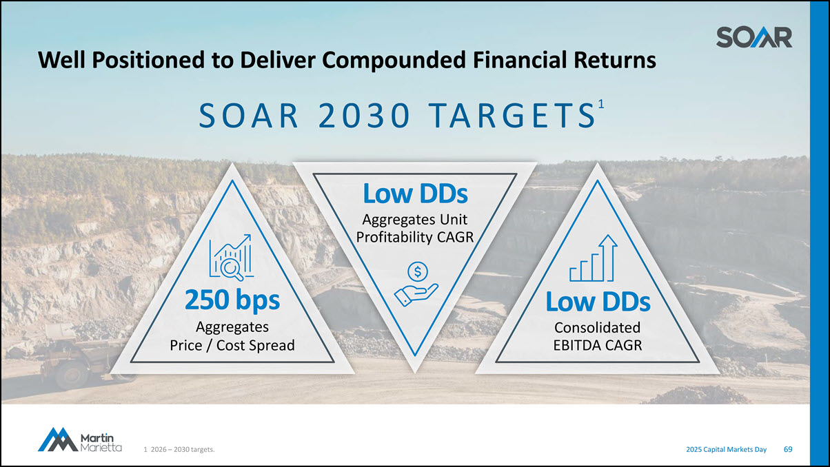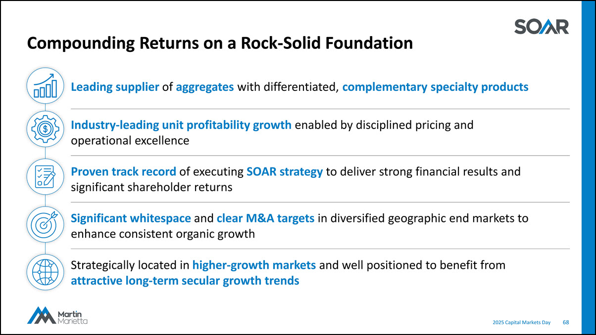 2025 Capital Markets Day  68  Compounding Returns on a Rock-Solid Foundation  Industry-leading unit profitability growth enabled by disciplined pricing and operational excellence  Proven track record of executing SOAR strategy to deliver strong financial results and significant shareholder returns  Significant whitespace and clear M&A targets in diversified geographic end markets to enhance consistent organic growth  Leading supplier of aggregates with differentiated, complementary specialty products  Strategically located in higher-growth markets and well positioned to benefit from attractive long-term secular growth trends