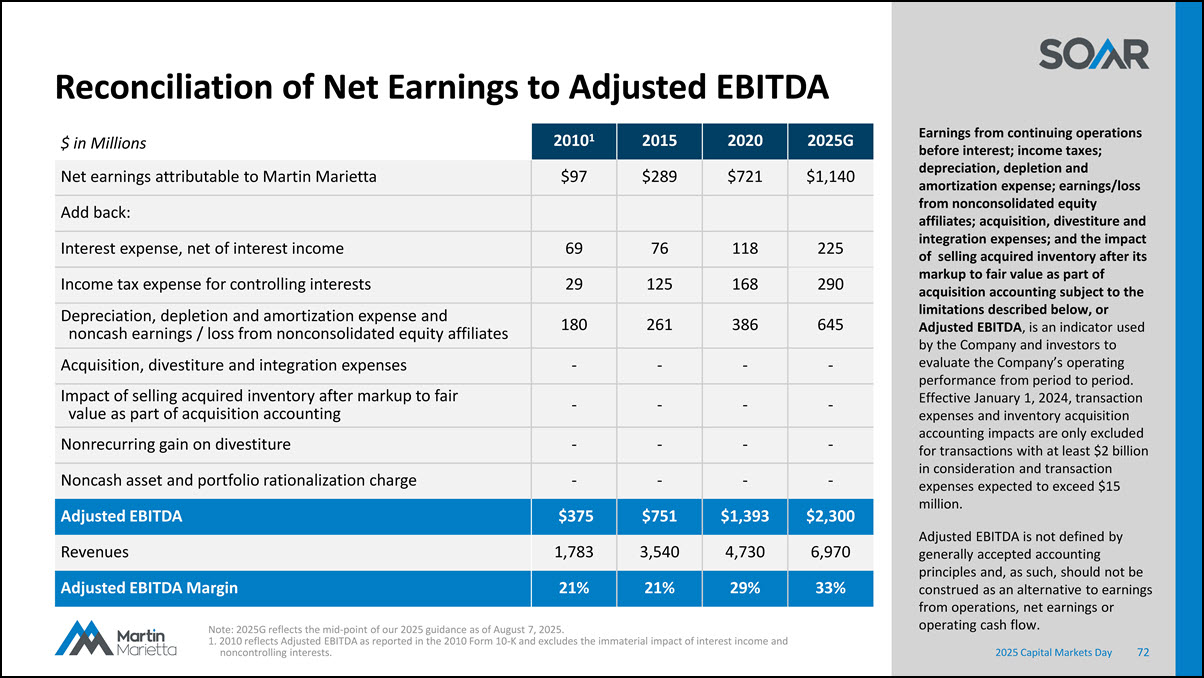 2025 Capital Markets Day  72  Note: 2025G reflects the mid-point of our 2025 guidance as of August 7, 2025.  1. 2010 reflects Adjusted EBITDA as reported in the 2010 Form 10-K and excludes the immaterial impact of interest income and noncontrolling interests.  Reconciliation of Net Earnings to Adjusted EBITDA  Earnings from continuing operations before interest; income taxes; depreciation, depletion and amortization expense; earnings/loss from nonconsolidated equity affiliates; acquisition, divestiture and integration expenses; and the impact of selling acquired inventory after its markup to fair value as part of acquisition accounting subject to the limitations described below, or Adjusted EBITDA, is an indicator used by the Company and investors to evaluate the Company’s operating performance from period to period. Effective January 1, 2024, transaction expenses and inventory acquisition accounting impacts are only excluded for transactions with at least $2 billion in consideration and transaction expenses expected to exceed $15 million.  Adjusted EBITDA is not defined by generally accepted accounting principles and, as such, should not be construed as an alternative to earnings from operations, net earnings or operating cash flow.   $ in Millions  20101  2015  2020  2025G  Net earnings attributable to Martin Marietta   $97  $289  $721  $1,140  Add back:  Interest expense, net of interest income  69  76  118  225  Income tax expense for controlling interests  29  125  168  290  Depreciation, depletion and amortization expense and    noncash earnings / loss from nonconsolidated equity affiliates  180  261  386   645  Acquisition, divestiture and integration expenses  -  -  -  -  Impact of selling acquired inventory after markup to fair    value as part of acquisition accounting  -  -  -  -  Nonrecurring gain on divestiture  -  -  -  -  Noncash asset and portfolio rationalization charge  -  -  -  -  Adjusted EBITDA   $375   $751  $1,393   $2,300  Revenues  1,783  3,540  4,730  6,970  Adjusted EBITDA Margin  21%  21%  29%  33%