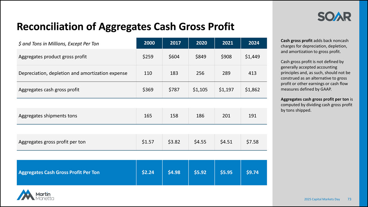 2025 Capital Markets Day  73  Reconciliation of Aggregates Cash Gross Profit   $ and Tons in Millions, Except Per Ton  2000  2017  2020  2021  2024  Aggregates product gross profit  $259  $604   $849   $908  $1,449  Depreciation, depletion and amortization expense  110  183  256  289  413  Aggregates cash gross profit  $369  $787  $1,105  $1,197  $1,862  Aggregates shipments tons  165  158  186   201  191  Aggregates gross profit per ton  $1.57  $3.82  $4.55  $4.51  $7.58  Aggregates Cash Gross Profit Per Ton  $2.24  $4.98  $5.92  $5.95  $9.74  Cash gross profit adds back noncash charges for depreciation, depletion, and amortization to gross profit.  Cash gross profit is not defined by generally accepted accounting principles and, as such, should not be construed as an alternative to gross profit or other earnings or cash flow measures defined by GAAP.  Aggregates cash gross profit per ton is computed by dividing cash gross profit by tons shipped.
