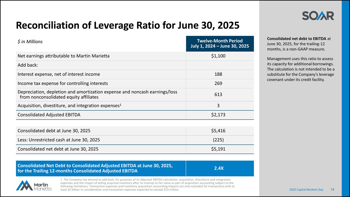 2025 Capital Markets Day  74  Reconciliation of Leverage Ratio for June 30, 2025  $ in Millions  Twelve-Month Period July 1, 2024 – June 30, 2025  Net earnings attributable to Martin Marietta   $1,100   Add back:  Interest expense, net of interest income  188   Income tax expense for controlling interests  269   Depreciation, depletion and amortization expense and noncash earnings/loss from nonconsolidated equity affiliates  613   Acquisition, divestiture, and integration expenses1  3  Consolidated Adjusted EBITDA  $2,173   Consolidated debt at June 30, 2025  $5,416   Less: Unrestricted cash at June 30, 2025  (225)  Consolidated net debt at June 30, 2025  $5,191  Consolidated Net Debt to Consolidated Adjusted EBITDA at June 30, 2025, for the Trailing 12-months Consolidated Adjusted EBITDA    2.4X   1 The Company has elected to add back, for purposes of its Adjusted EBITDA calculation, acquisition, divestiture and integration expenses and the impact of selling acquired inventory after its markup to fair value as part of acquisition accounting subject to the following limitations. Transaction expenses and inventory acquisition accounting impacts are only excluded for transactions with at least $2 billion in consideration and transaction expenses expected to exceed $15 million.   Consolidated net debt to EBITDA at June 30, 2025, for the trailing-12 months, is a non-GAAP measure.  Management uses this ratio to assess its capacity for additional borrowings. The calculation is not intended to be a substitute for the Company’s leverage covenant under its credit facility.