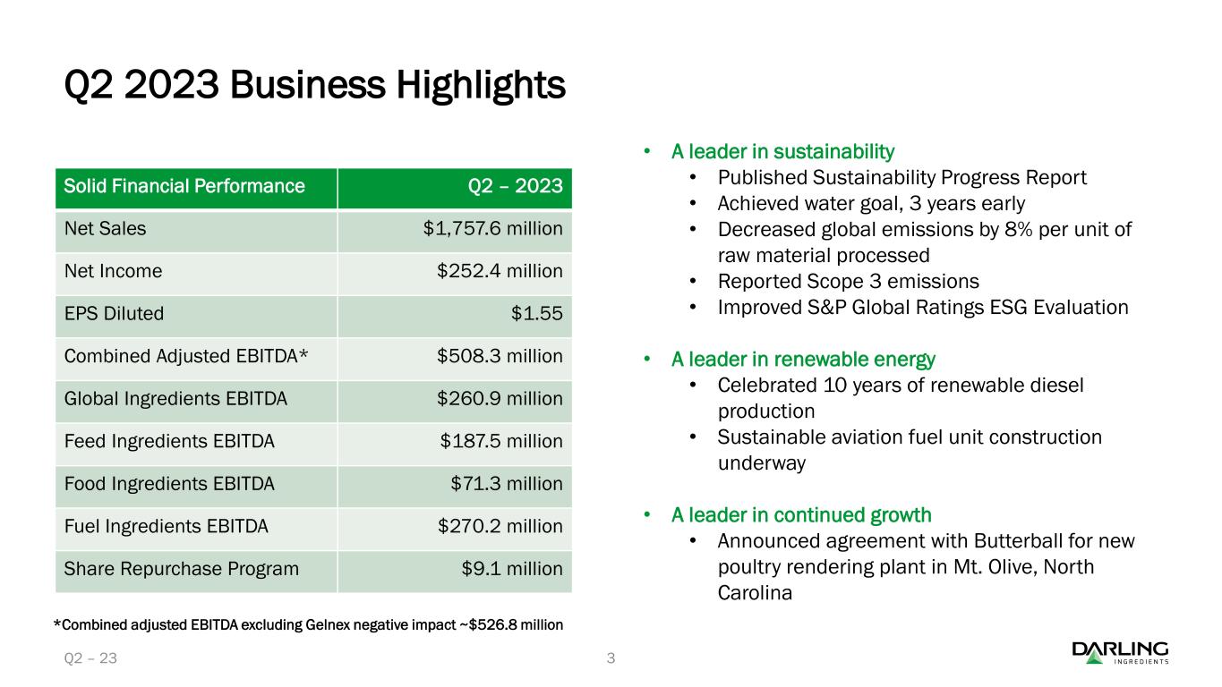 Safe Harbor Statement The presentation includes “forward-looking” statements that are subject to risks and uncertainties that could cause actual results to differ materially from those expressed or implied in the statements. Statements that are not statements of historical facts are forward-looking statements and are made pursuant to the safe harbor provisions of the Private Securities Litigation Reform Act of 1995. Words such as “estimate,” “guidance,” “outlook,” “project,” “planned,” “contemplate,” “potential,” “possible,” “proposed,” “intend,” “believe,” “anticipate,” “expect,” “may,” “will,” “would,” “should,” “could,” and similar expressions are intended to identify forward-looking statements. All statements other than statements of historical facts included in this presentation are forward looking statements. Forward-looking statements are based on the Company's current expectations and assumptions regarding its business, the economy and other future conditions. The Company cautions readers that any such forward-looking statements it makes are not guarantees of future performance and that actual results may differ materially from anticipated results or expectations expressed in its forward-looking statements as a result of a variety of factors, including many that are beyond the Company's control. Important factors that could cause actual results to differ materially from the Company’s expectations include: existing and unknown future limitations on the ability of the Company's direct and indirect subsidiaries to make their cash flow available to the Company for payments on the Company's indebtedness or other purposes; global demands for bio-fuels and grain and oilseed commodities, which have exhibited volatility, and can impact the cost of feed for cattle, hogs and poultry, thus affecting available rendering feedstock and selling prices for the Company’s products; reductions in raw material volumes available to the Company due to weak margins in the meat production industry as a result of higher feed costs, reduced consumer demand or other factors, reduced volume from food service establishments, or otherwise; reduced demand for animal feed; reduced finished product prices, including a decline in fat and used cooking oil finished product prices; changes to worldwide government policies relating to renewable fuels and greenhouse gas (“GHG”) emissions that adversely affect programs like the U.S. government's renewable fuel standard, low carbon fuel standards (“LCFS”) and tax credits for biofuels both in the United States and abroad; possible product recall resulting from developments relating to the discovery of unauthorized adulterations to food or food additives; the occurrence of 2009 H1N1 flu (initially known as “Swine Flu”), highly pathogenic strains of avian influenza (collectively known as “Bird Flu”), severe acute respiratory syndrome (“SARS”), bovine spongiform encephalopathy (or “BSE”), porcine epidemic diarrhea (“PED”) or other diseases associated with animal origin in the United States or elsewhere, such as the outbreak of African Swine Fever in China and elsewhere; the occurrence of pandemics, epidemics or disease outbreaks, such as the COVID-19 outbreak; unanticipated costs and/or reductions in raw material volumes related to the Company’s compliance with the existing or unforeseen new U.S. or foreign (including, without limitation, China) regulations (including new or modified animal feed, Bird Flu, SARS, PED, BSE or ASF or similar or unanticipated regulations) affecting the industries in which the Company operates or its value added products; risks associated with the DGD Joint Venture, including possible unanticipated operating disruptions, a decline in margins on the products produced by the DGD Joint Venture and issues relating to the announced SAF upgrade project; risks and uncertainties relating to international sales and operations, including imposition of tariffs, quotas, trade barriers and other trade protections imposed by foreign countries; tax changes, such as the introduction of a global minimum tax; difficulties or a significant disruption in the Company's information systems or failure to implement new systems and software successfully; risks relating to possible third party claims of intellectual property infringement; increased contributions to the Company’s pension and benefit plans, including multiemployer and employer-sponsored defined benefit pension plans as required by legislation, regulation or other applicable U.S. or foreign law or resulting from a U.S. mass withdrawal event; bad debt write-offs; loss of or failure to obtain necessary permits and registrations; continued or escalated conflict in the Middle East, North Korea, Ukraine or elsewhere, including the Russia-Ukraine war; uncertainty regarding the exit of the U.K. from the European Union; and/or unfavorable export or import markets. These factors, coupled with volatile prices for natural gas and diesel fuel, inflation rates, climate conditions, currency exchange fluctuations, general performance of the U.S. and global economies, disturbances in world financial, credit, commodities and stock markets, such as the recent turmoil in the world banking markets, and any decline in consumer confidence and discretionary spending, including the inability of consumers and companies to obtain credit due to lack of liquidity in the financial markets, among others, could cause actual results to vary materially from the forward-looking statements included in this report or negatively impact the Company's results of operations. Among other things, future profitability may be affected by the Company’s ability to grow its business, which faces competition from companies that may have substantially greater resources than the Company. The Company’s announced share repurchase program may be 
