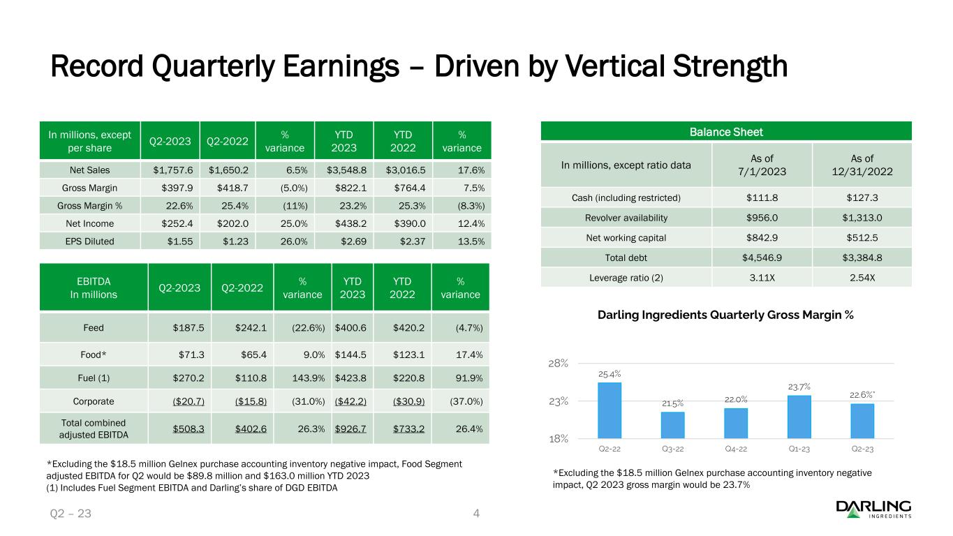Q2 2023 Business Highlights Q2 – 23 3 Solid Financial Performance Q2 – 2023 Net Sales $1,757.6 million Net Income $252.4 million EPS Diluted $1.55 Combined Adjusted EBITDA* $508.3 million Global Ingredients EBITDA $260.9 million Feed Ingredients EBITDA $187.5 million Food Ingredients EBITDA $71.3 million Fuel Ingredients EBITDA $270.2 million Share Repurchase Program $9.1 million • A leader in sustainability • Published Sustainability Progress Report • Achieved water goal, 3 years early • Decreased global emissions by 8% per unit of raw material processed • Reported Scope 3 emissions • Improved S&P Global Ratings ESG Evaluation • A leader in renewable energy • Celebrated 10 years of renewable diesel production • Sustainable aviation fuel unit construction underway • A leader in continued growth • Announced agreement with Butterball for new poultry rendering plant in Mt. Olive, North Carolina *Combined adjusted EBITDA excluding Gelnex negative impact ~$526.8 million