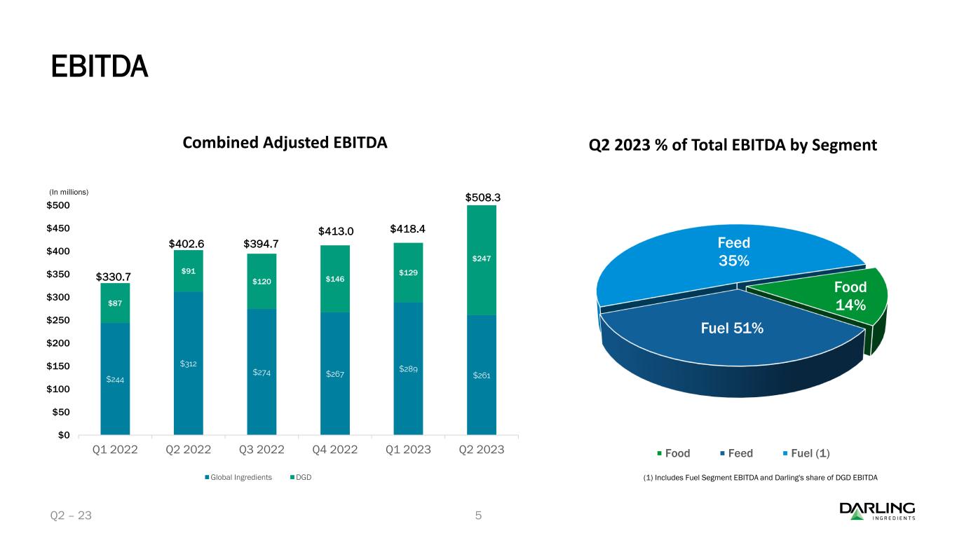 Record Quarterly Earnings – Driven by Vertical Strength Q2 – 23 4 In millions, except per share Q2-2023 Q2-2022 % variance YTD 2023 YTD 2022 % variance Net Sales $1,757.6 $1,650.2 6.5% $3,548.8 $3,016.5 17.6% Gross Margin $397.9 $418.7 (5.0%) $822.1 $764.4 7.5% Gross Margin % 22.6% 25.4% (11%) 23.2% 25.3% (8.3%) Net Income $252.4 $202.0 25.0% $438.2 $390.0 12.4% EPS Diluted $1.55 $1.23 26.0% $2.69 $2.37 13.5% EBITDA In millions Q2-2023 Q2-2022 % variance YTD 2023 YTD 2022 % variance Feed $187.5 $242.1 (22.6%) $400.6 $420.2 (4.7%) Food* $71.3 $65.4 9.0% $144.5 $123.1 17.4% Fuel (1) $270.2 $110.8 143.9% $423.8 $220.8 91.9% Corporate ($20.7) ($15.8) (31.0%) ($42.2) ($30.9) (37.0%) Total combined adjusted EBITDA $508.3 $402.6 26.3% $926.7 $733.2 26.4% 25.4% 21.5% 22.0% 23.7% 22.6%* 18% 23% 28% Q2-22 Q3-22 Q4-22 Q1-23 Q2-23 Balance Sheet In millions, except ratio data As of 7/1/2023 As of 12/31/2022 Cash (including restricted) $111.8 $127.3 Revolver availability $956.0 $1,313.0 Net working capital $842.9 $512.5 Total debt $4,546.9 $3,384.8 Leverage ratio (2) 3.11X 2.54X Darling Ingredients Quarterly Gross Margin % *Excluding the $18.5 million Gelnex purchase accounting inventory negative impact, Food Segment adjusted EBITDA for Q2 would be $89.8 million and $163.0 million YTD 2023 (1) Includes Fuel Segment EBITDA and Darling’s share of DGD EBITDA *Excluding the $18.5 million Gelnex purchase accounting inventory negative impact, Q2 2023 gross margin would be 23.7%
