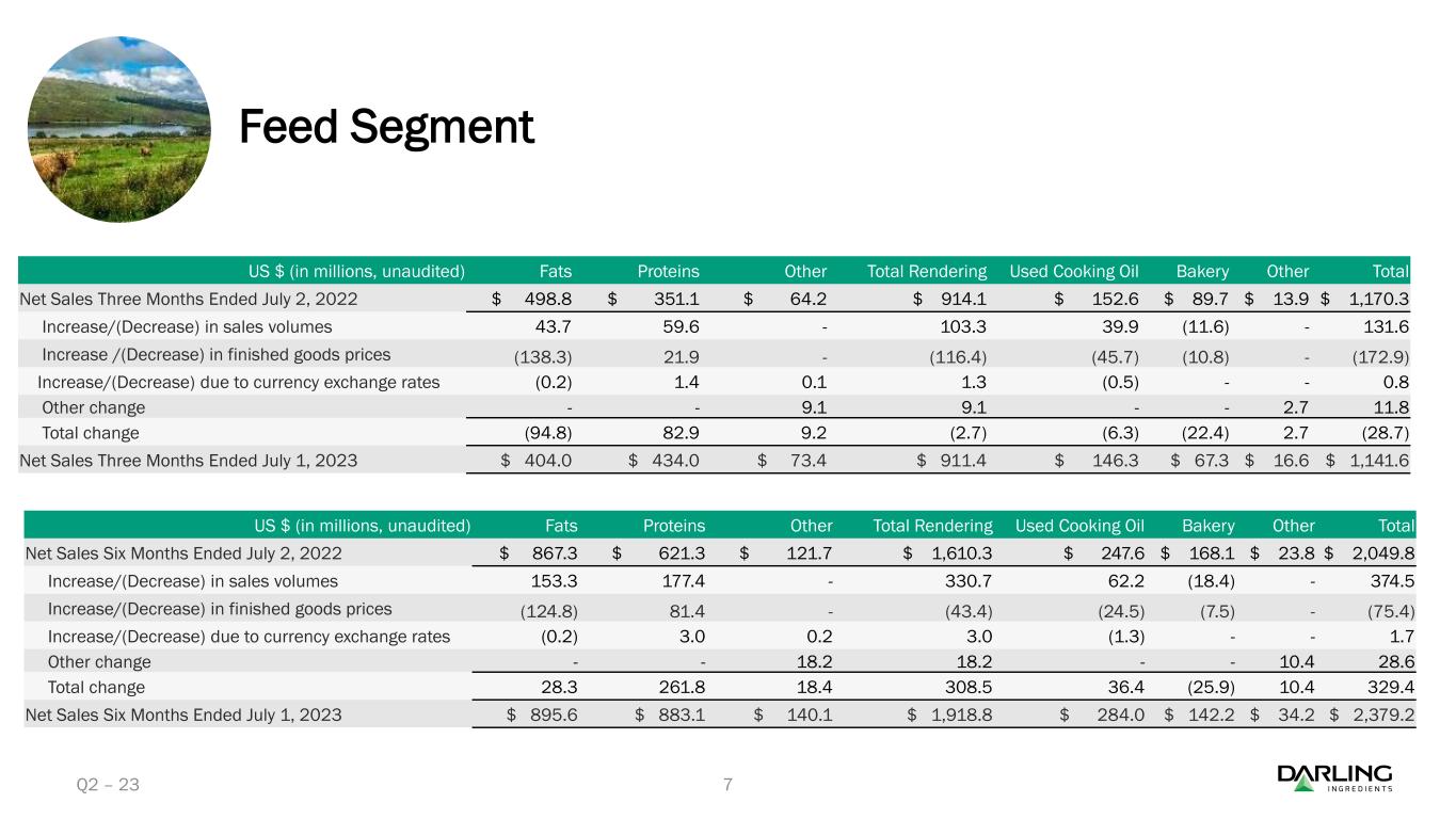 Feed Segment Key Drivers • Lower fat prices drove decrease in net sales • Decreased raw material driven by reduced slaughter house volumes • Raw material volumes starting to increase moving into Q3 • Protein prices remain strong, export demand continues to be strong • Despite lower fat prices, gross margins held flat vs. Q1 2023 due to continued integration efforts • Fat prices have rebounded slightly, expect continued improvement in back half of 2023 Q2 – 23 6 US $ (in millions) Q2-2023 Q2-2022 YTD-2023 YTD-2022 Net Sales $ 1,141,661 $ 1,170,347 $ 2,379,155 $ 2,049,785 Cost of sales & operating expenses 876,413 864,306 1,826,485 1,509,829 Gross Margin $ 265,248 $ 306,041 $ 552,670 $ 539,956 Selling, general & administrative expenses 77,406 64,863 152,097 121,072 Loss (gain) on sale of assets 322 (964) (20) (1,305) Depreciation & amortization 82,575 68,938 172,895 123,288 Change in fair value of contingent consideration (7,499) - (7,499) - Restructuring and asset impairment charges - 8,557 92 8,557 Segment Operating Income $ 112,444 $ 164,647 $ 235,105 $ 288,344 Equity in net income of other unconsolidated subsidiaries 1,849 2,272 1,969 3,632 Segment Income $ 114,293 $ 166,919 $ 237,074 $ 291,976 Segment EBITDA $ 187,520 $ 242,142 $ 400,593 $ 420,189 Raw material processed (mmts)* 3.1 2.7 6.3 5.0