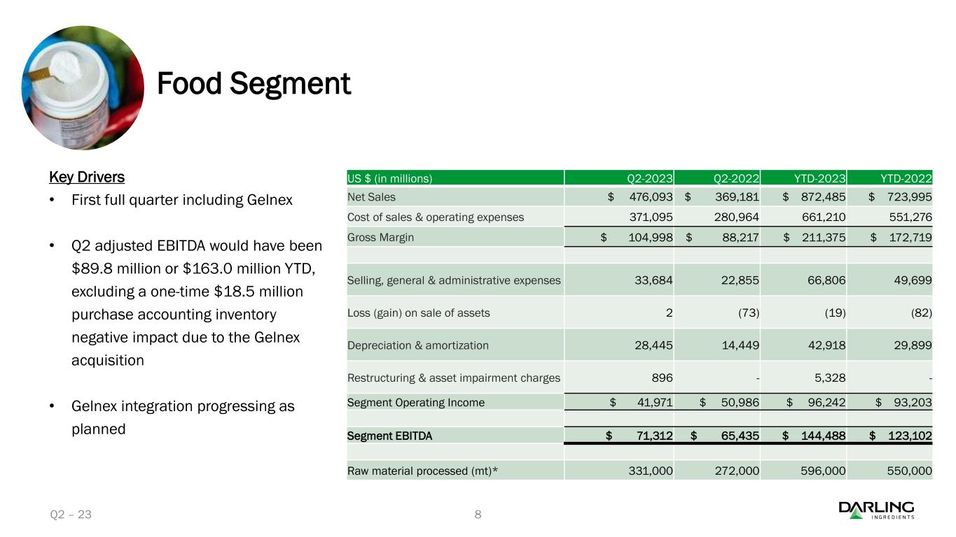 Feed Segment Q2 – 23 7 US $ (in millions, unaudited) Fats Proteins Other Total Rendering Used Cooking Oil Bakery Other Total Net Sales Three Months Ended July 2, 2022 $ 498.8 $ 351.1 $ 64.2 $ 914.1 $ 152.6 $ 89.7 $ 13.9 $ 1,170.3 Increase/(Decrease) in sales volumes 43.7 59.6 - 103.3 39.9 (11.6) - 131.6 Increase /(Decrease) in finished goods prices (138.3) 21.9 - (116.4) (45.7) (10.8) - (172.9) Increase/(Decrease) due to currency exchange rates (0.2) 1.4 0.1 1.3 (0.5) - - 0.8 Other change - - 9.1 9.1 - - 2.7 11.8 Total change (94.8) 82.9 9.2 (2.7) (6.3) (22.4) 2.7 (28.7) Net Sales Three Months Ended July 1, 2023 $ 404.0 $ 434.0 $ 73.4 $ 911.4 $ 146.3 $ 67.3 $ 16.6 $ 1,141.6 US $ (in millions, unaudited) Fats Proteins Other Total Rendering Used Cooking Oil Bakery Other Total Net Sales Six Months Ended July 2, 2022 $ 867.3 $ 621.3 $ 121.7 $ 1,610.3 $ 247.6 $ 168.1 $ 23.8 $ 2,049.8 Increase/(Decrease) in sales volumes 153.3 177.4 - 330.7 62.2 (18.4) - 374.5 Increase/(Decrease) in finished goods prices (124.8) 81.4 - (43.4) (24.5) (7.5) - (75.4) Increase/(Decrease) due to currency exchange rates (0.2) 3.0 0.2 3.0 (1.3) - - 1.7 Other change - - 18.2 18.2 - - 10.4 28.6 Total change 28.3 261.8 18.4 308.5 36.4 (25.9) 10.4 329.4 Net Sales Six Months Ended July 1, 2023 $ 895.6 $ 883.1 $ 140.1 $ 1,918.8 $ 284.0 $ 142.2 $ 34.2 $ 2,379.2