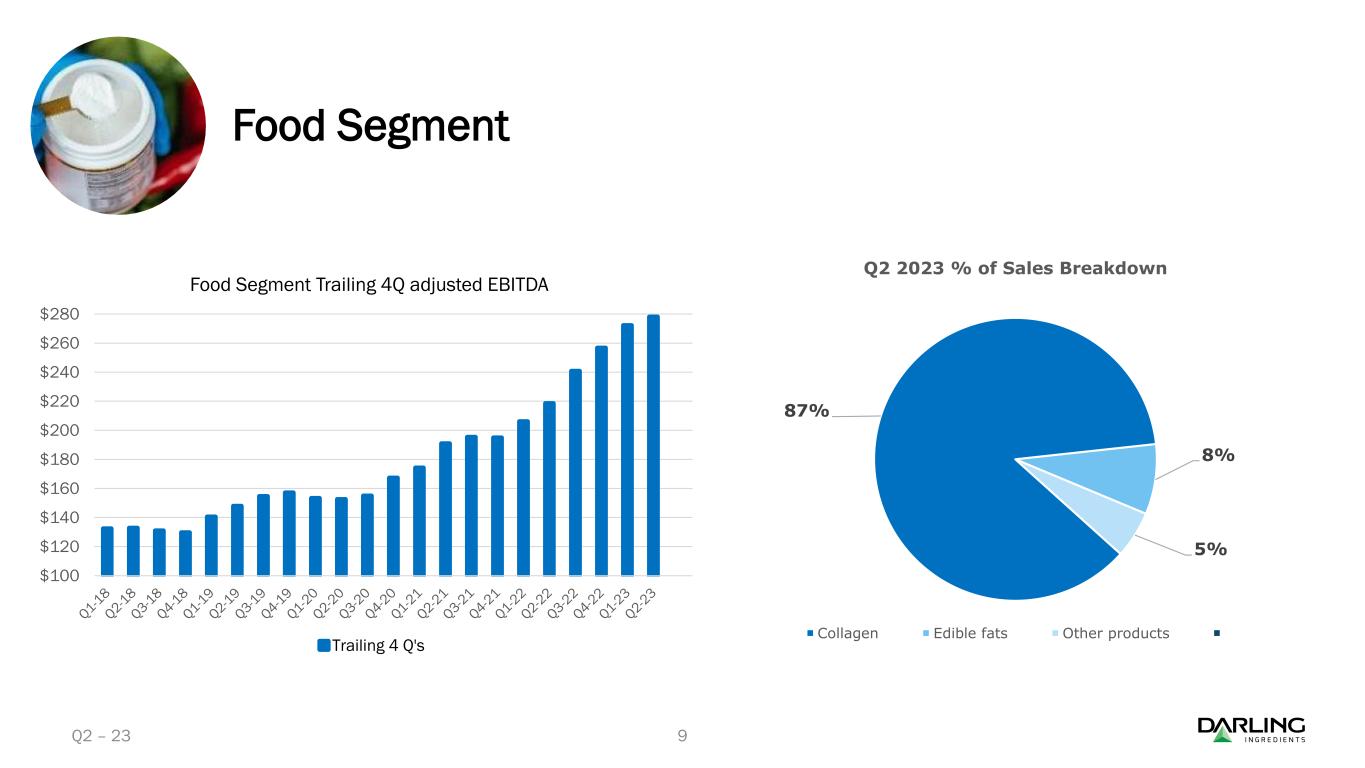 Food Segment Key Drivers • First full quarter including Gelnex • Q2 adjusted EBITDA would have been $89.8 million or $163.0 million YTD, excluding a one-time $18.5 million purchase accounting inventory negative impact due to the Gelnex acquisition • Gelnex integration progressing as planned Q2 – 23 8 US $ (in millions) Q2-2023 Q2-2022 YTD-2023 YTD-2022 Net Sales $ 476,093 $ 369,181 $ 872,485 $ 723,995 Cost of sales & operating expenses 371,095 280,964 661,210 551,276 Gross Margin $ 104,998 $ 88,217 $ 211,375 $ 172,719 Selling, general & administrative expenses 33,684 22,855 66,806 49,699 Loss (gain) on sale of assets 2 (73) (19) (82) Depreciation & amortization 28,445 14,449 42,918 29,899 Restructuring & asset impairment charges 896 - 5,328 - Segment Operating Income $ 41,971 $ 50,986 $ 96,242 $ 93,203 Segment EBITDA $ 71,312 $ 65,435 $ 144,488 $ 123,102 Raw material processed (mt)* 331,000 272,000 596,000 550,000