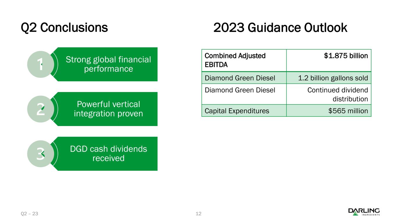 Q2 Conclusions Combined Adjusted EBITDA $1.875 billion Diamond Green Diesel 1.2 billion gallons sold Diamond Green Diesel Continued dividend distribution Capital Expenditures $565 million Q2 – 23 12 2023 Guidance Outlook Strong global financial performance Powerful vertical integration proven DGD cash dividends received