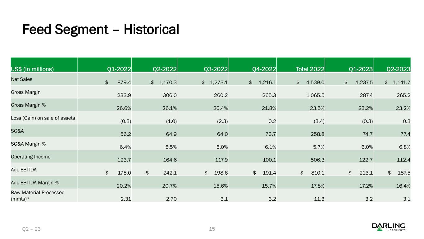Feed Segment – Historical US$ (in millions) Q1-2022 Q2-2022 Q3-2022 Q4-2022 Total 2022 Q1-2023 Q2-2023 Net Sales $ 879.4 $ 1,170.3 $ 1,273.1 $ 1,216.1 $ 4,539.0 $ 1,237.5 $ 1,141.7 Gross Margin 233.9 306.0 260.2 265.3 1,065.5 287.4 265.2 Gross Margin % 26.6% 26.1% 20.4% 21.8% 23.5% 23.2% 23.2% Loss (Gain) on sale of assets (0.3) (1.0) (2.3) 0.2 (3.4) (0.3) 0.3 SG&A 56.2 64.9 64.0 73.7 258.8 74.7 77.4 SG&A Margin % 6.4% 5.5% 5.0% 6.1% 5.7% 6.0% 6.8% Operating Income 123.7 164.6 117.9 100.1 506.3 122.7 112.4 Adj. EBITDA $ 178.0 $ 242.1 $ 198.6 $ 191.4 $ 810.1 $ 213.1 $ 187.5 Adj. EBITDA Margin % 20.2% 20.7% 15.6% 15.7% 17.8% 17.2% 16.4% Raw Material Processed (mmts)* 2.31 2.70 3.1 3.2 11.3 3.2 3.1 Q2 – 23 15
